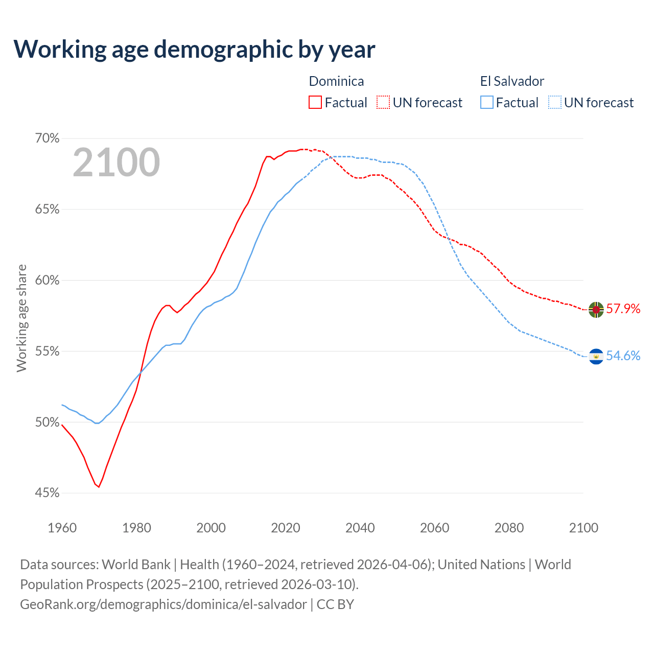 - Dominica has 45.3K working age adults (aged 15-64) vs 4.29M in El Salvador.
