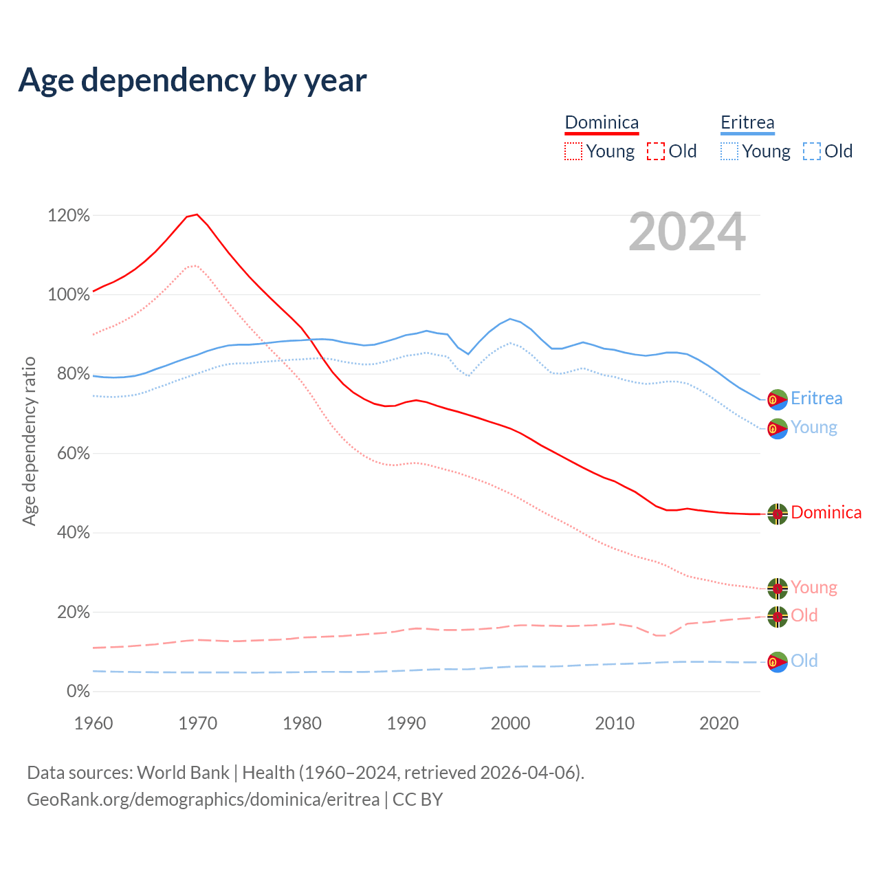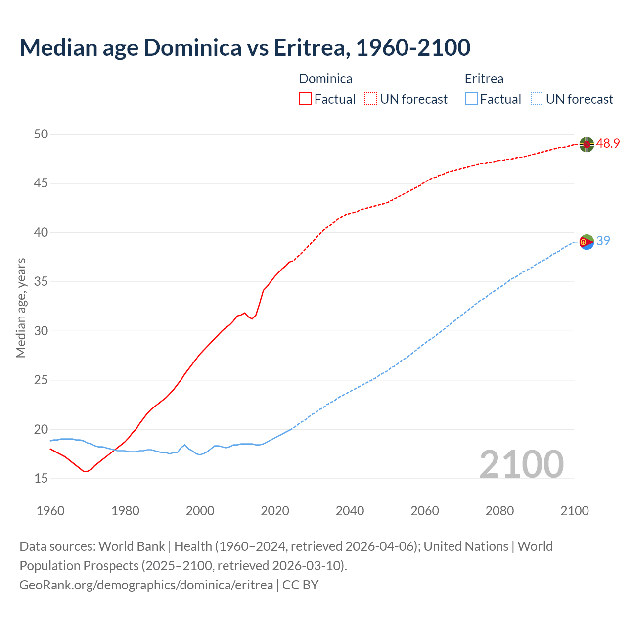 - Dominica is ranked 66/196 by median age (oldest to youngest) vs 168/196 for Eritrea.