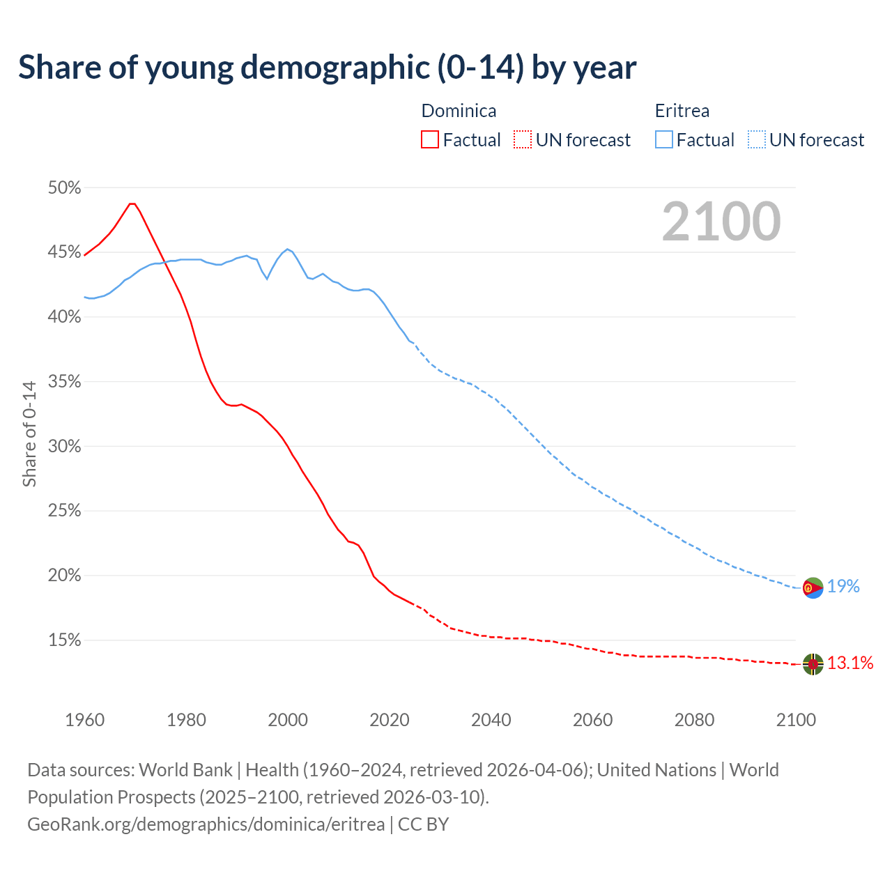 - The share of young demographic (0-15 years old) in Dominica is 17.9% vs 38.1% in Eritrea.