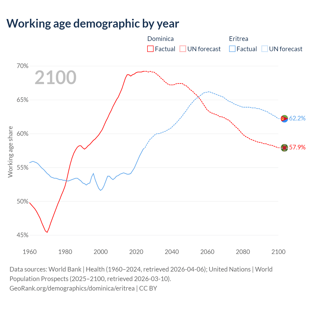 - Dominica has 45.3K working age adults (aged 15-64) vs 2.13M in Eritrea.