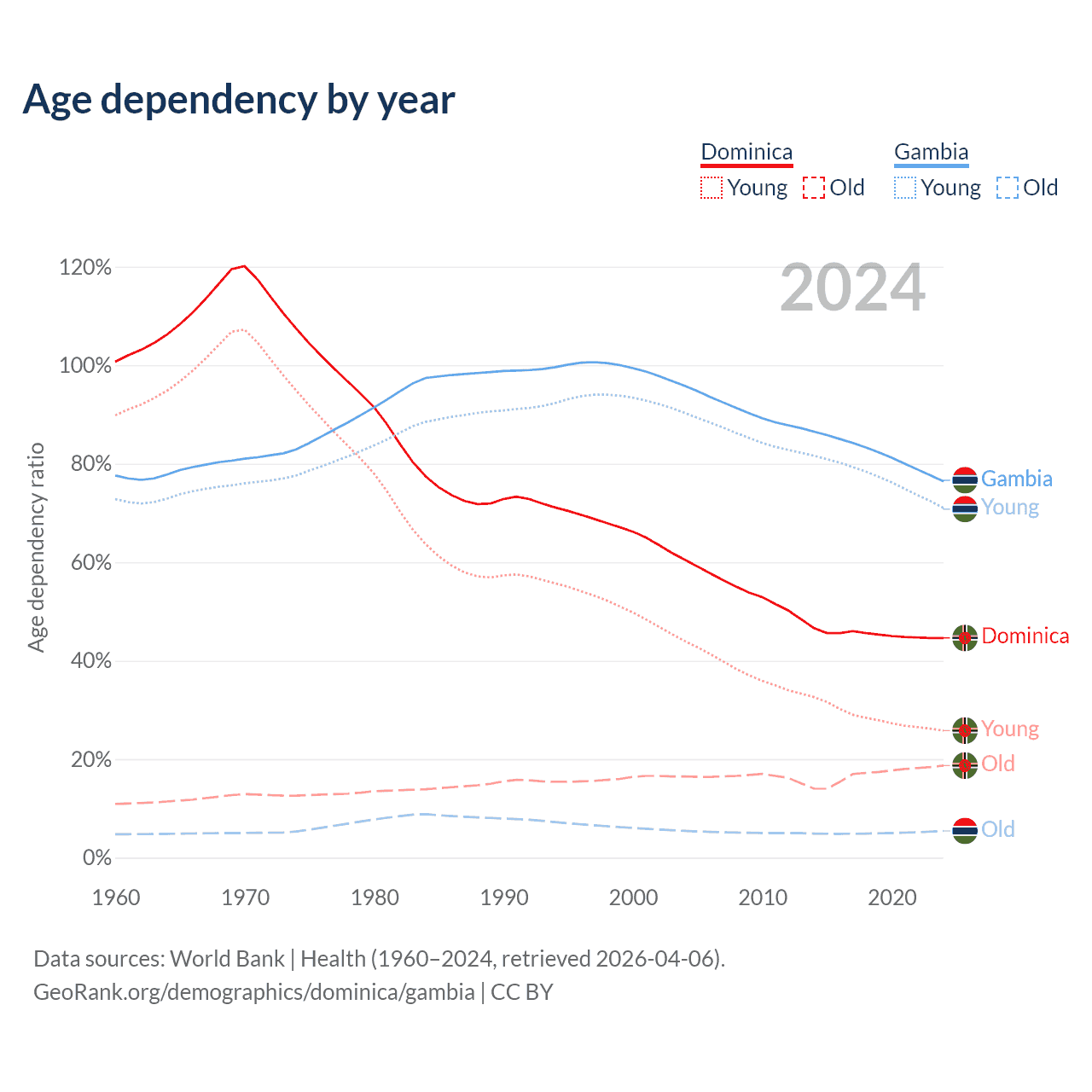 - Dominica is ranked 66/196 by median age (oldest to youngest) vs 171/196 for the Gambia.