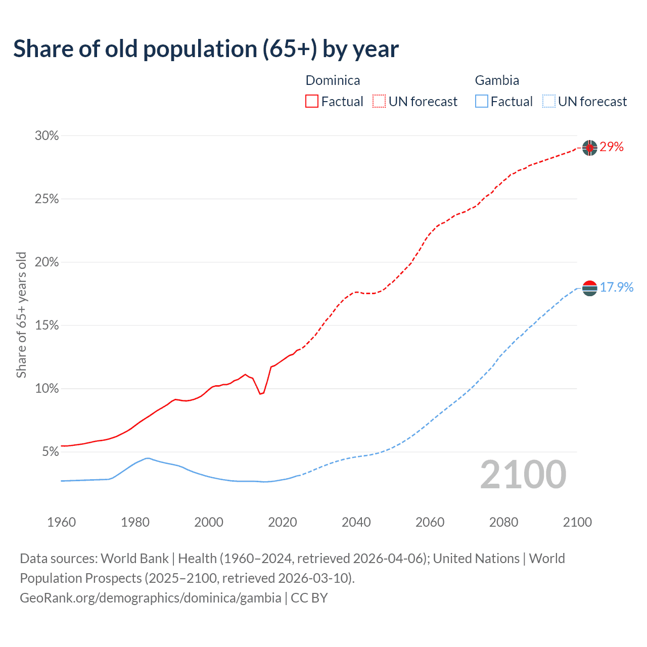 The share of older people aged 65 and over is 13% in Dominica and 3.08% in the Gambia. Life expectancy in Dominica compared to the Gambia .