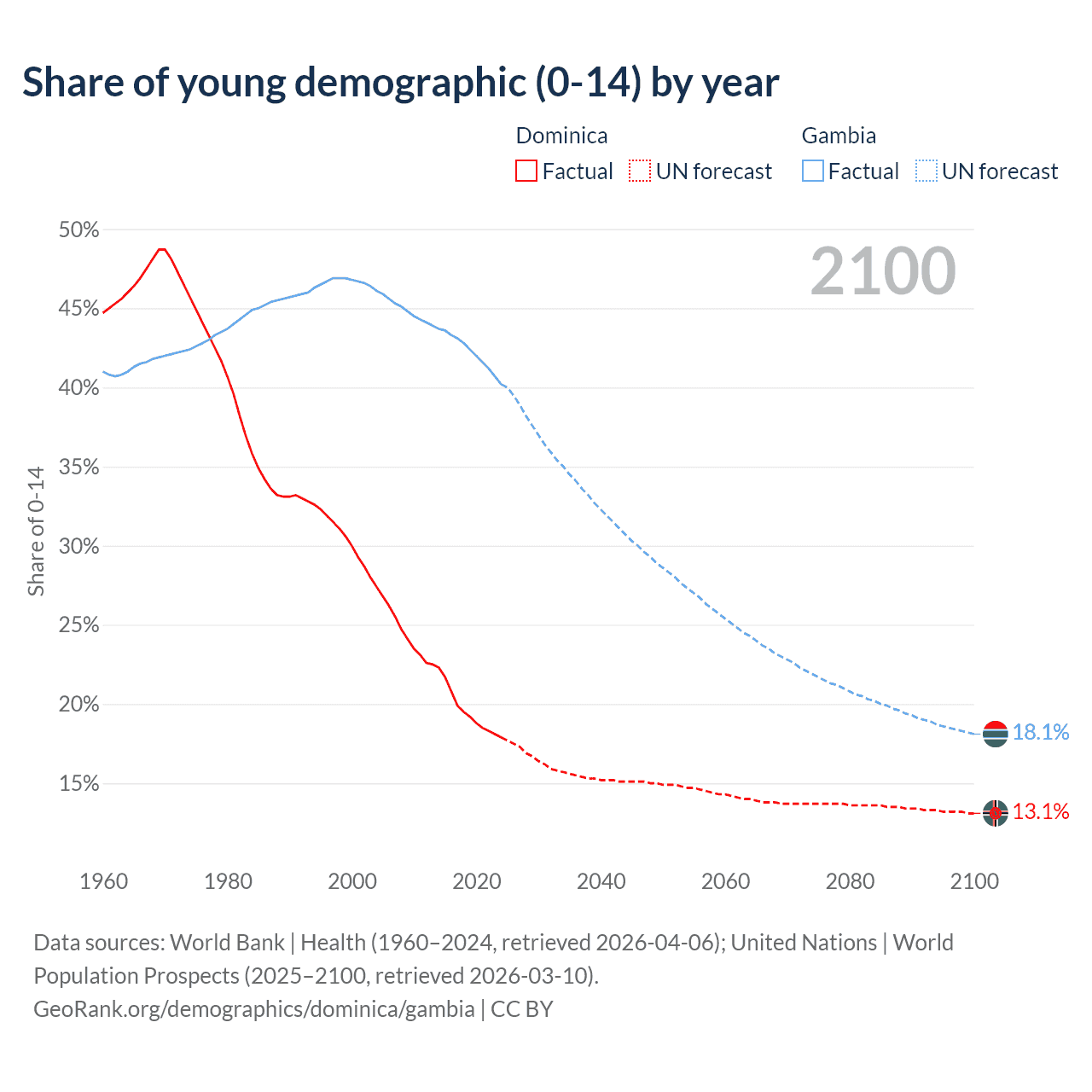 - The share of young demographic (0-15 years old) in Dominica is 17.9% vs 40.2% in the Gambia.