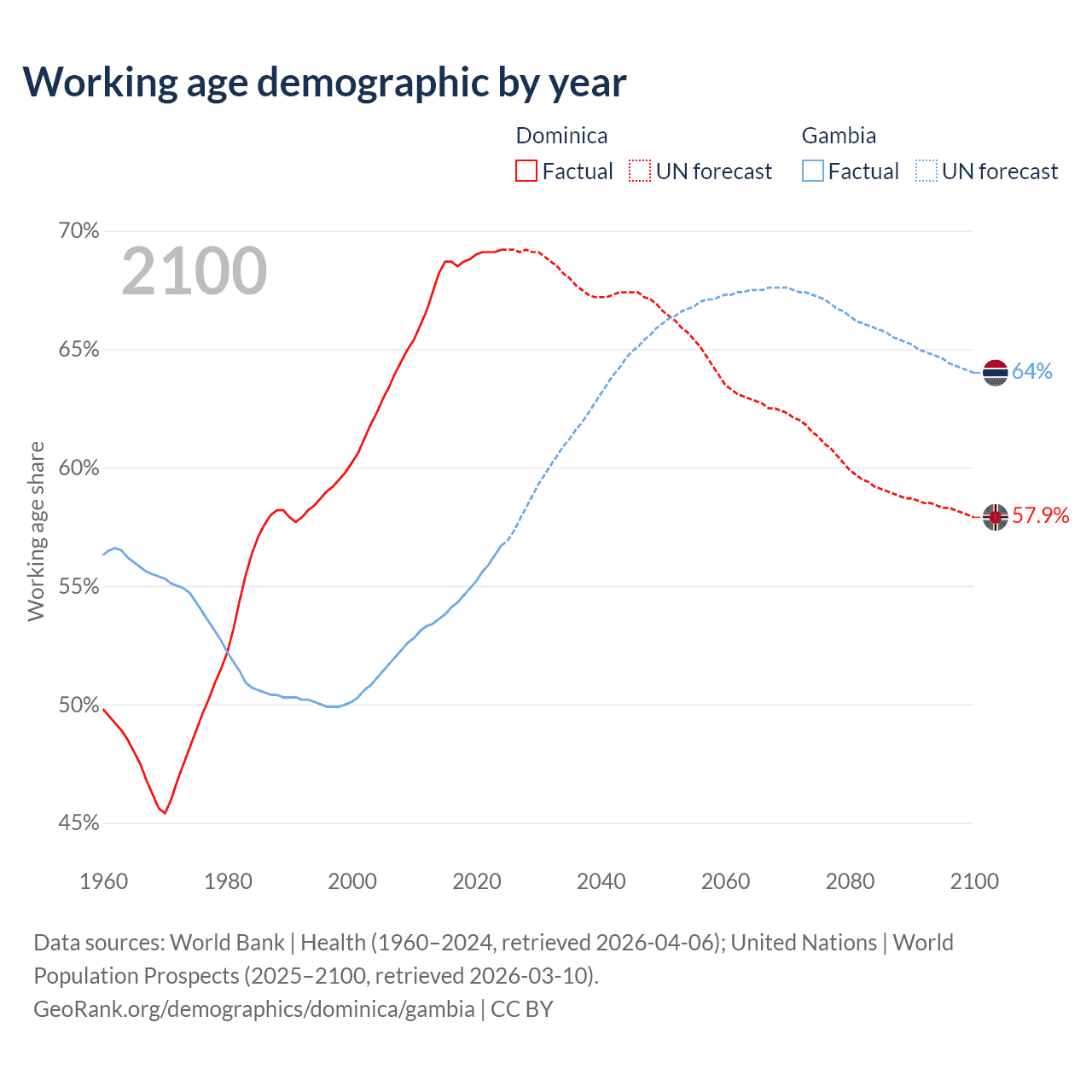 - Dominica has 45.3K working age adults (aged 15-64) vs 1.64M in the Gambia.