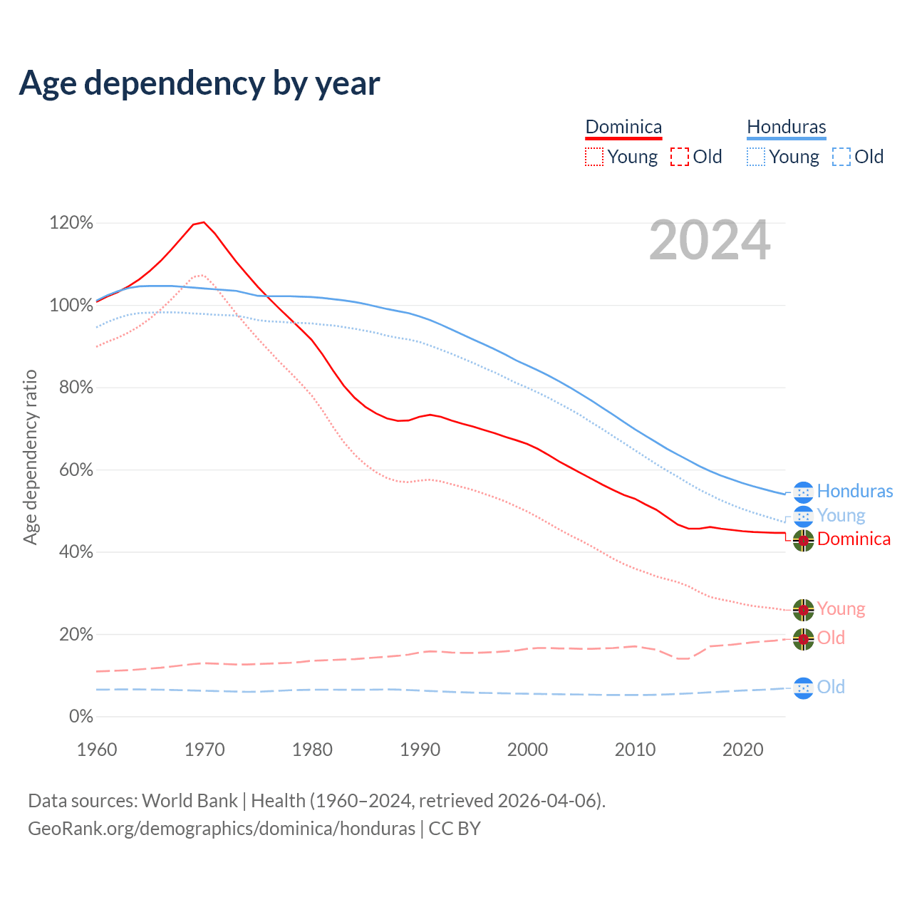 - Dominica is ranked 66/196 by median age (oldest to youngest) vs 134/196 for Honduras.