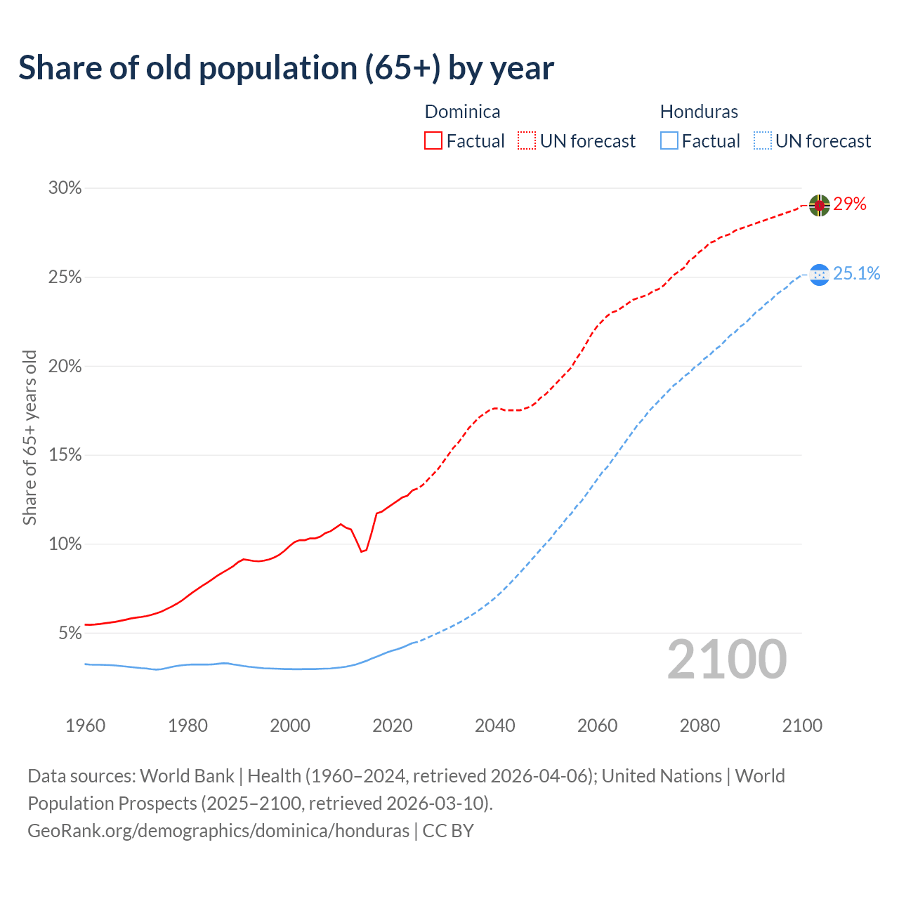The share of older people aged 65 and over is 13% in Dominica and 4.42% in Honduras. Life expectancy in Dominica compared to Honduras .