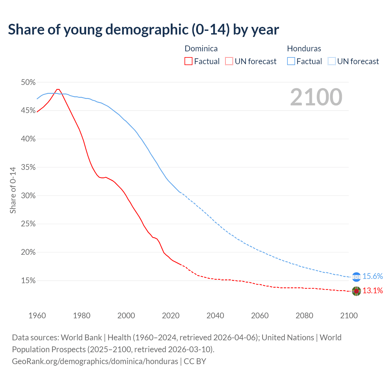 - The share of young demographic (0-15 years old) in Dominica is 17.9% vs 30.6% in Honduras.