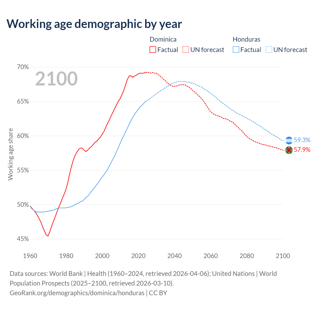 - Dominica has 45.3K working age adults (aged 15-64) vs 7.3M in Honduras.