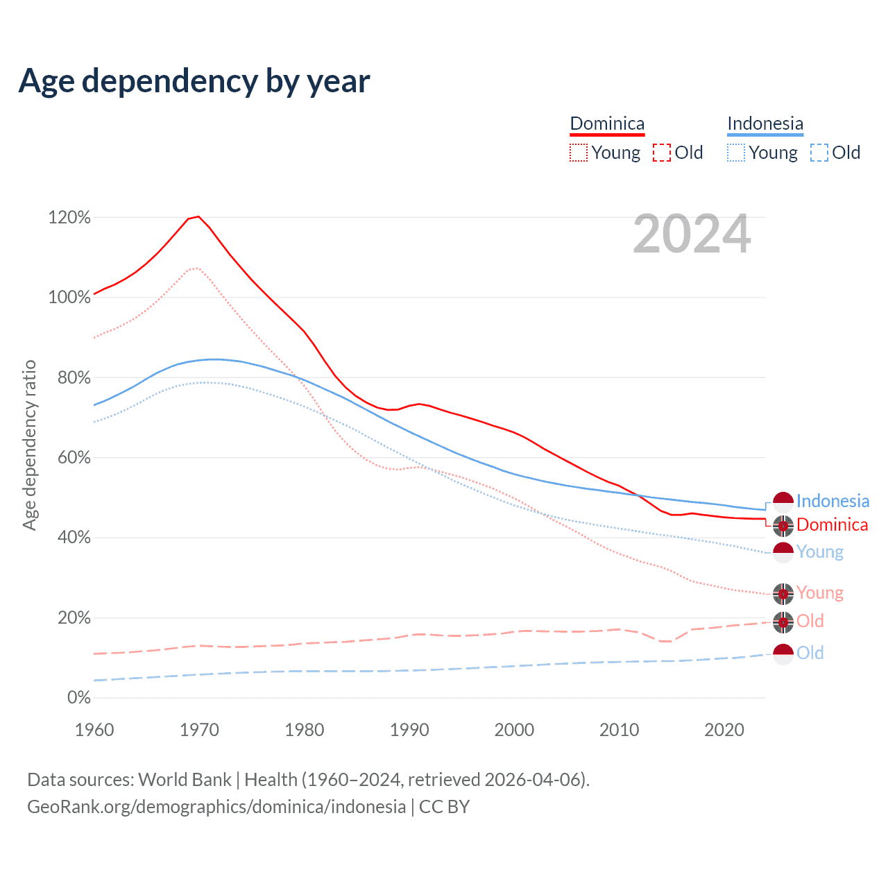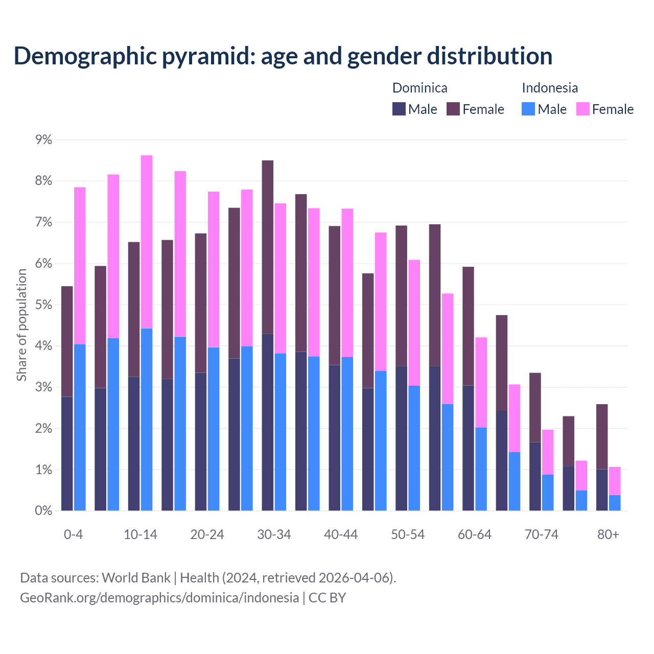 - Dominica is ranked 66/196 by median age (oldest to youngest) vs 93/196 for Indonesia.