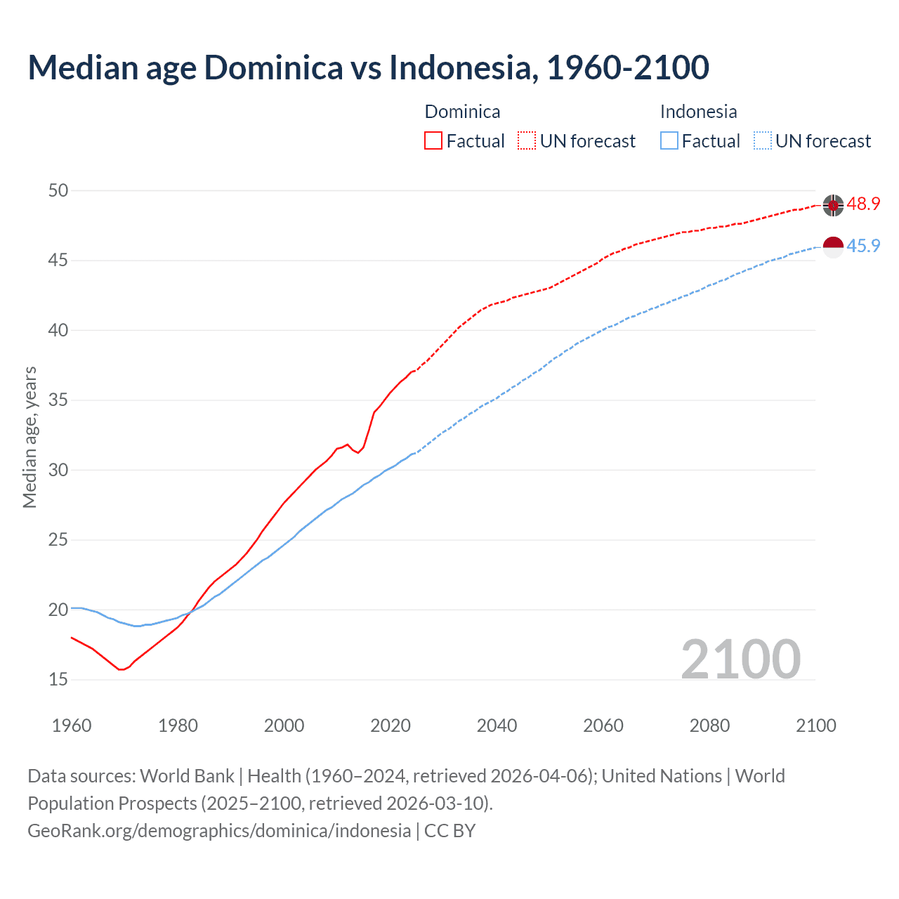 Median age Dominica vs Indonesia, 1960-2100
