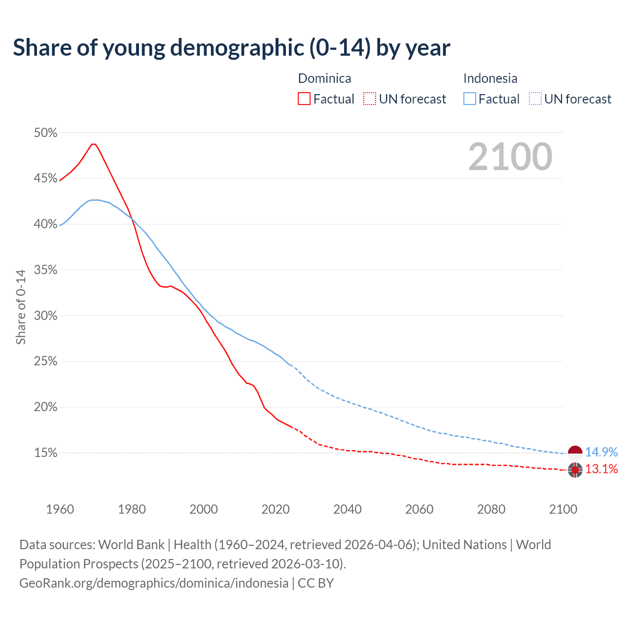 - The share of young demographic (0-15 years old) in Dominica is 17.9% vs 24.6% in Indonesia.