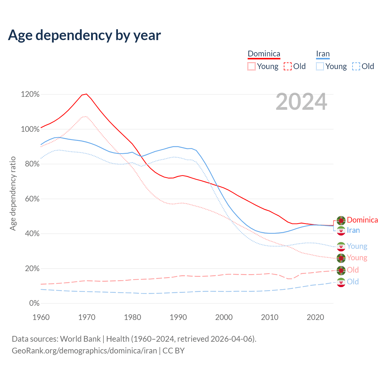 - The share of old-age demographic (65+) in Dominica is 13% vs 8.24% in Iran.