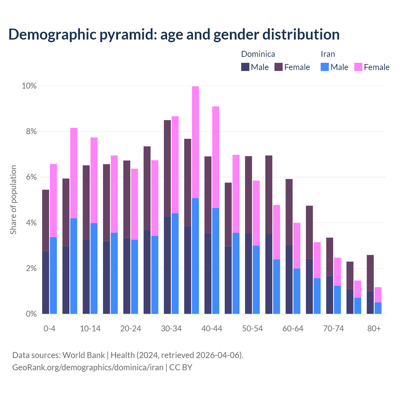 - Dominica is ranked 66/196 by median age (oldest to youngest) vs 79/196 for Iran.