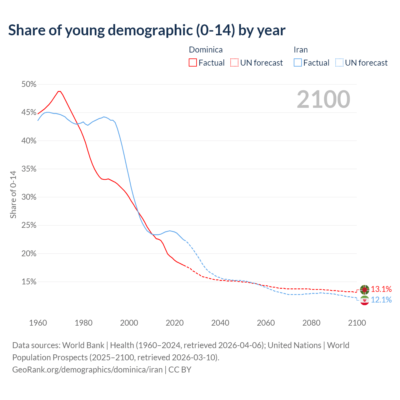 - The share of young demographic (0-15 years old) in Dominica is 17.9% vs 22.4% in Iran.