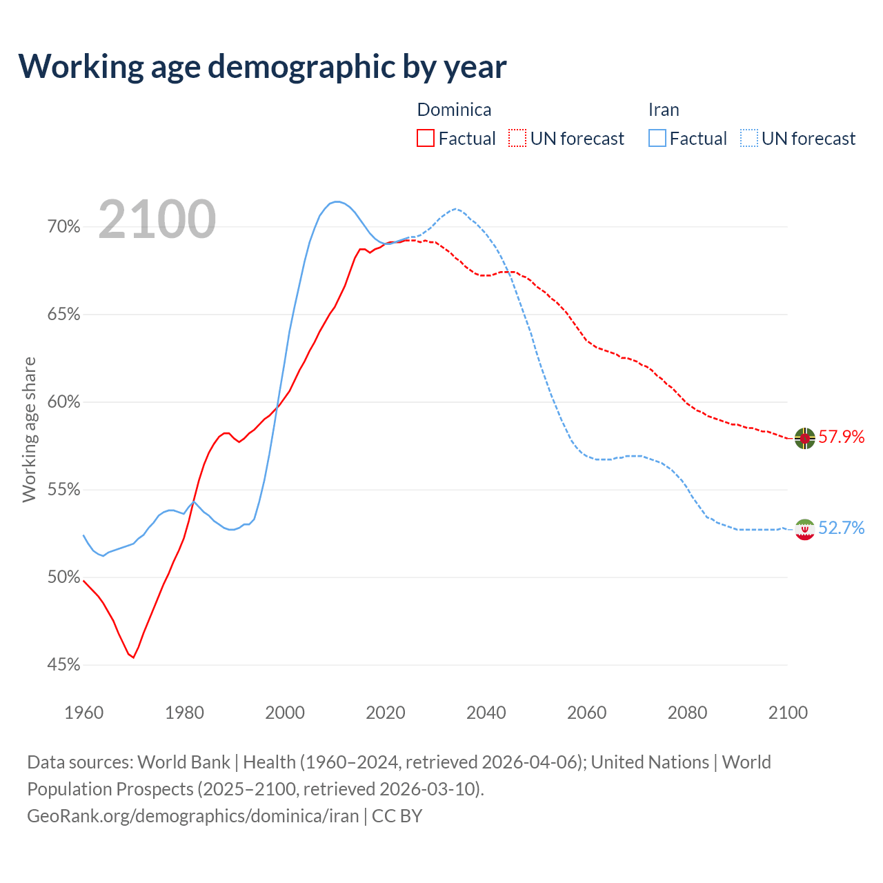 - Dominica has 45.3K working age adults (aged 15-64) vs 64.8M in Iran.