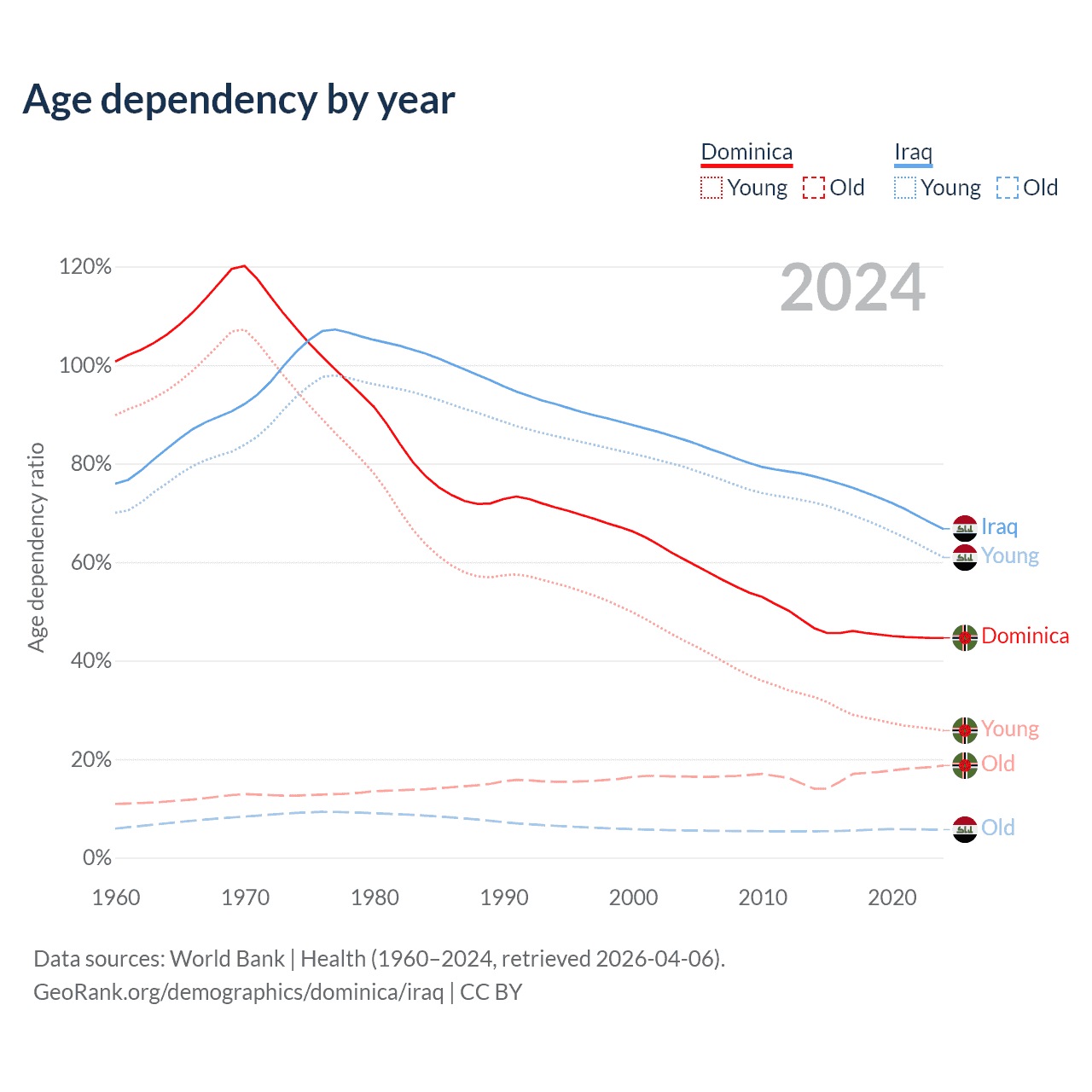 - The share of old-age demographic (65+) in Dominica is 13% vs 3.41% in Iraq.