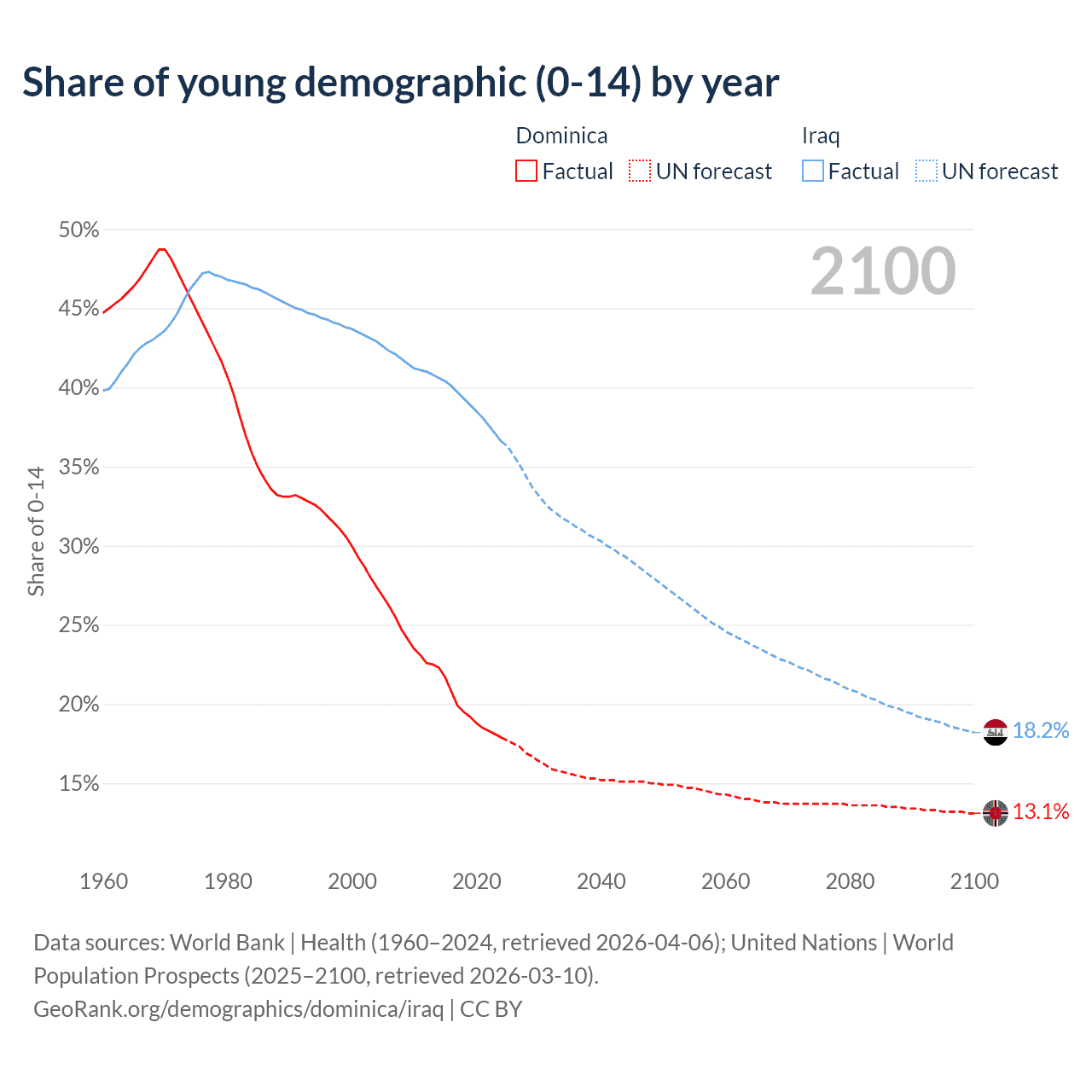 - The share of young demographic (0-15 years old) in Dominica is 17.9% vs 36.6% in Iraq.