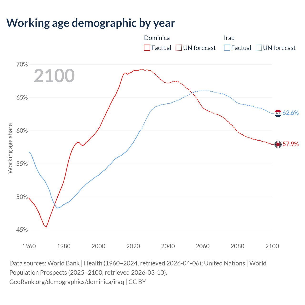 - Dominica has 45.3K working age adults (aged 15-64) vs 29M in Iraq.