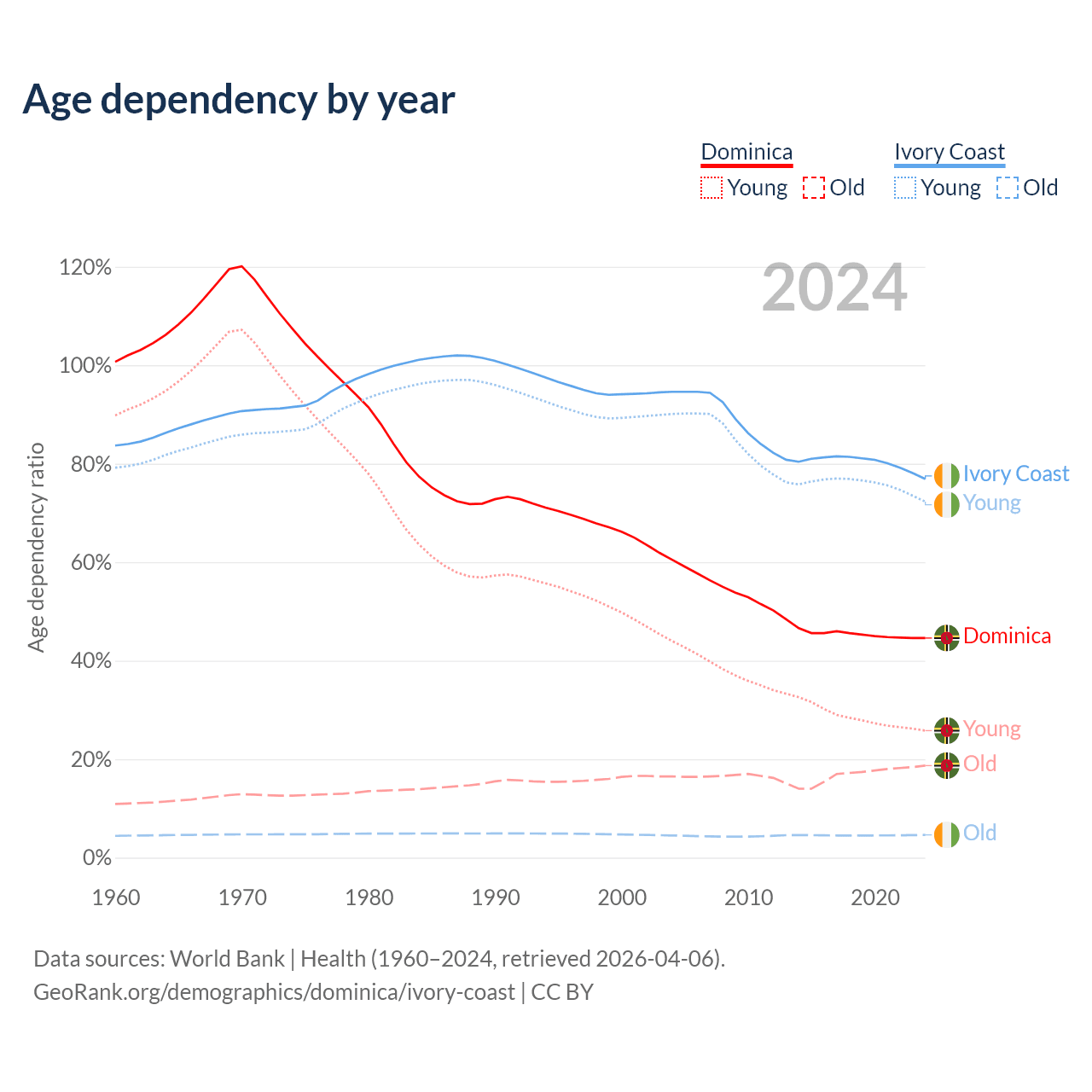 - Dominica is ranked 66/196 by median age (oldest to youngest) vs 175/196 for Ivory Coast.