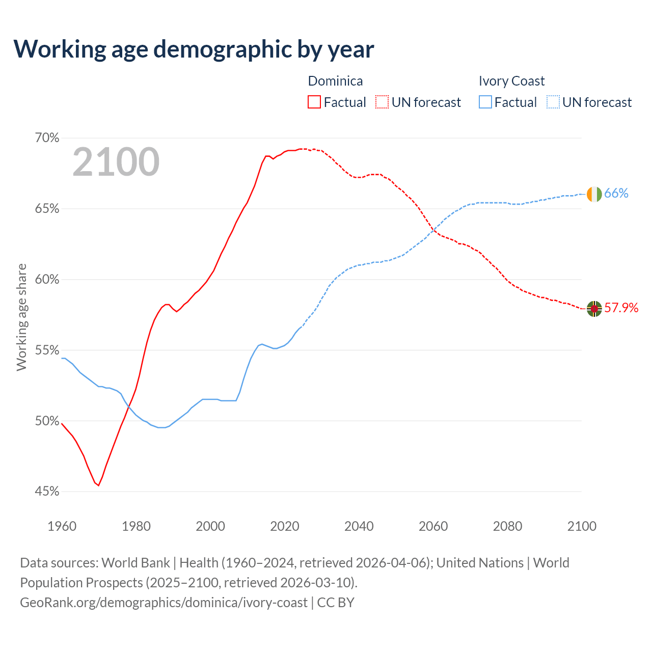 - Dominica has 45.3K working age adults (aged 15-64) vs 19.1M in Ivory Coast.