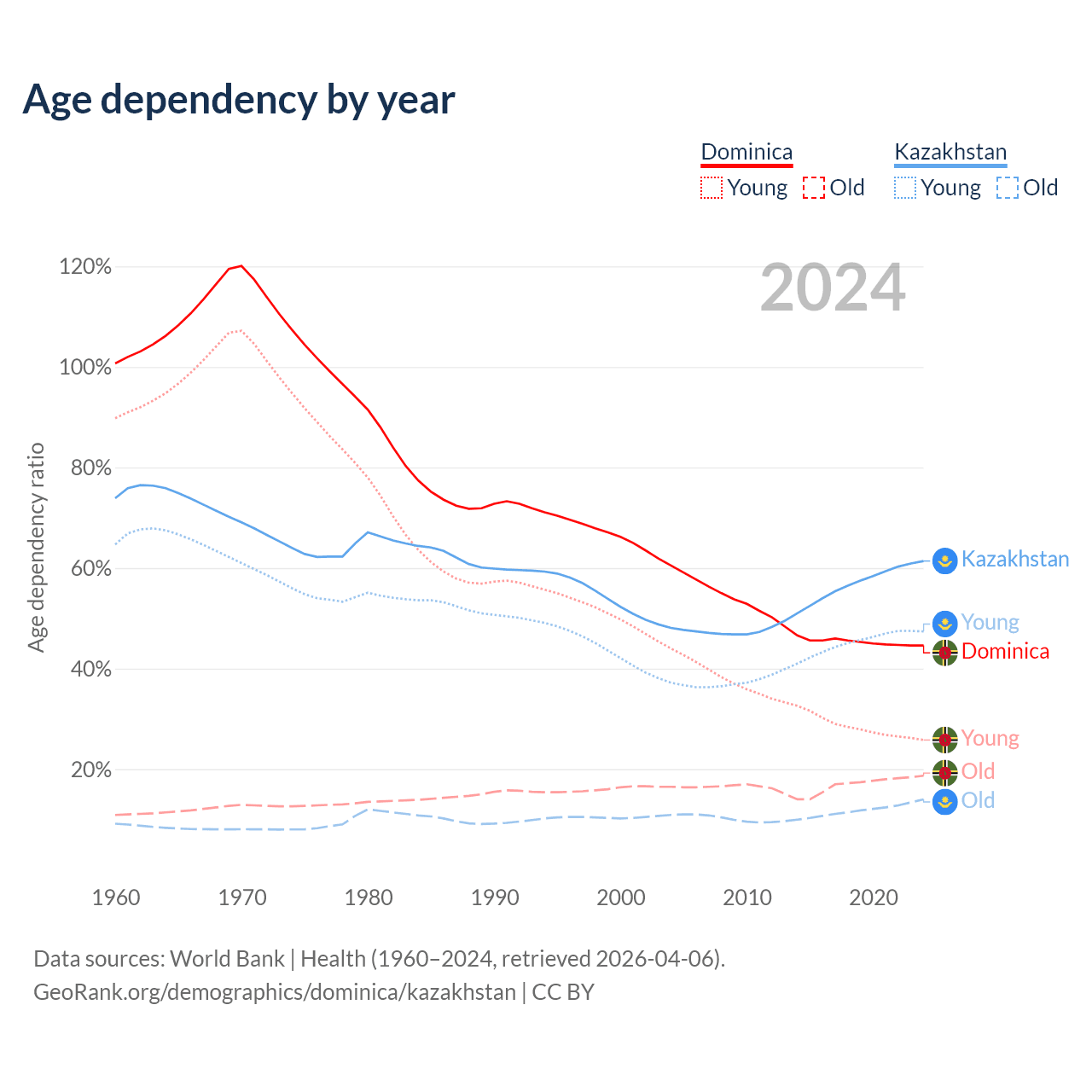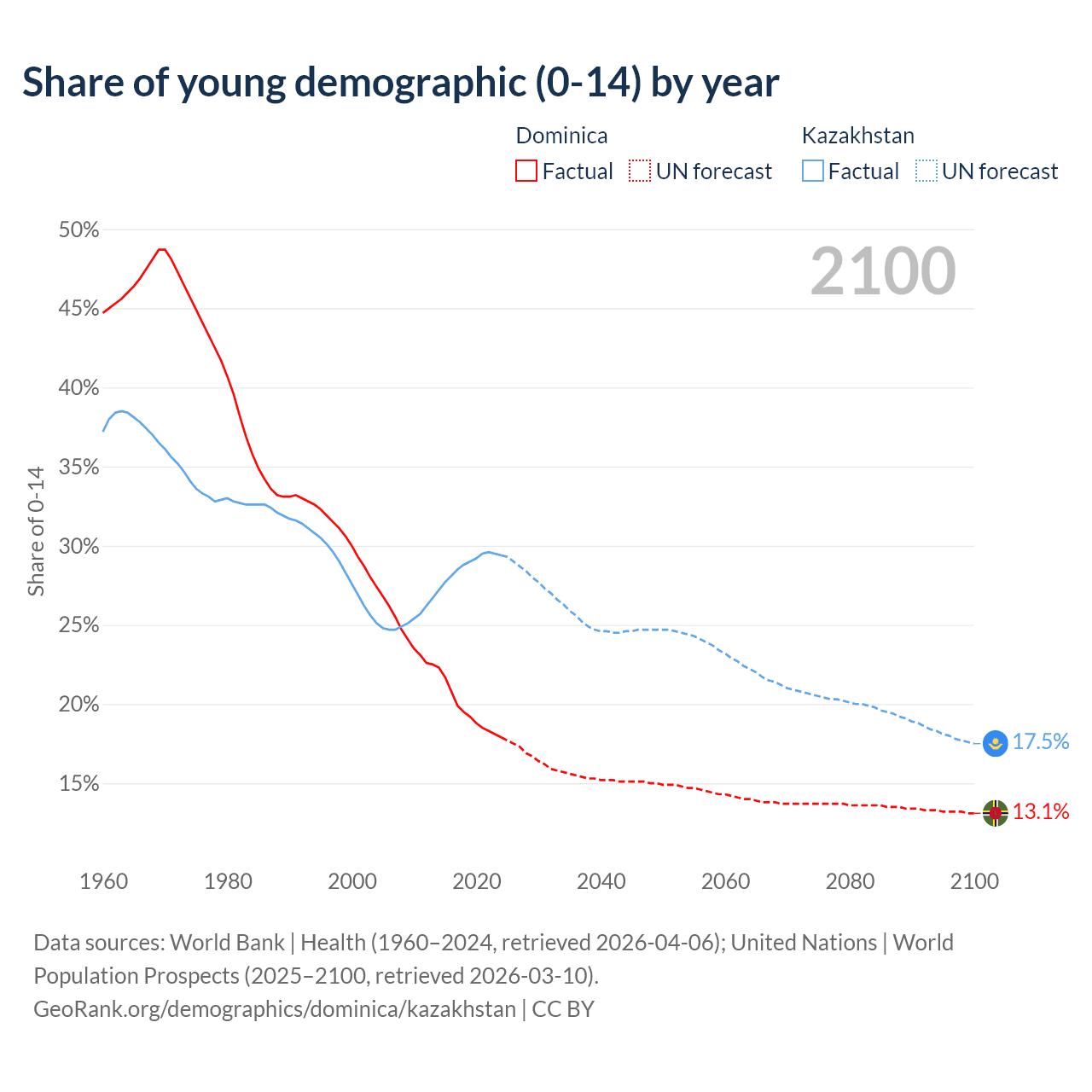 - The share of young demographic (0-15 years old) in Dominica is 17.9% vs 29.4% in Kazakhstan.