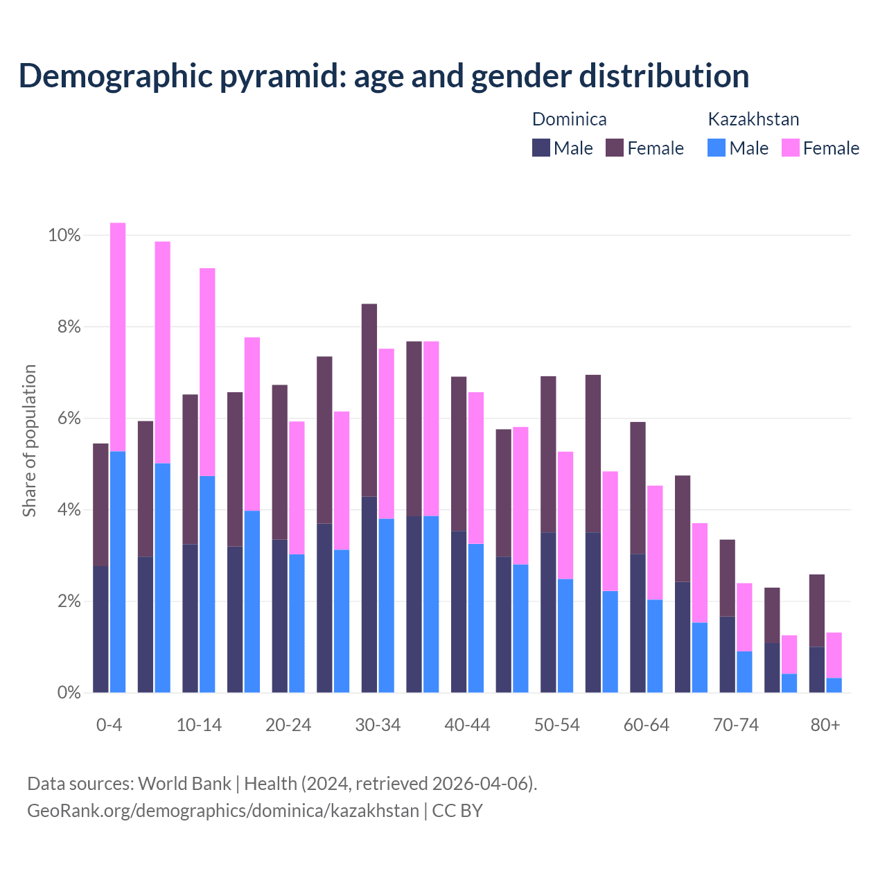 - Dominica is ranked 66/196 by median age (oldest to youngest) vs 99/196 for Kazakhstan.