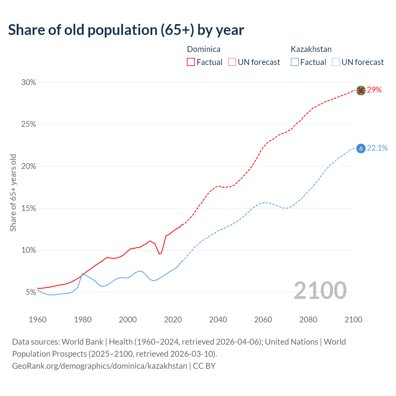 Median age Dominica vs Kazakhstan, 1960-2100