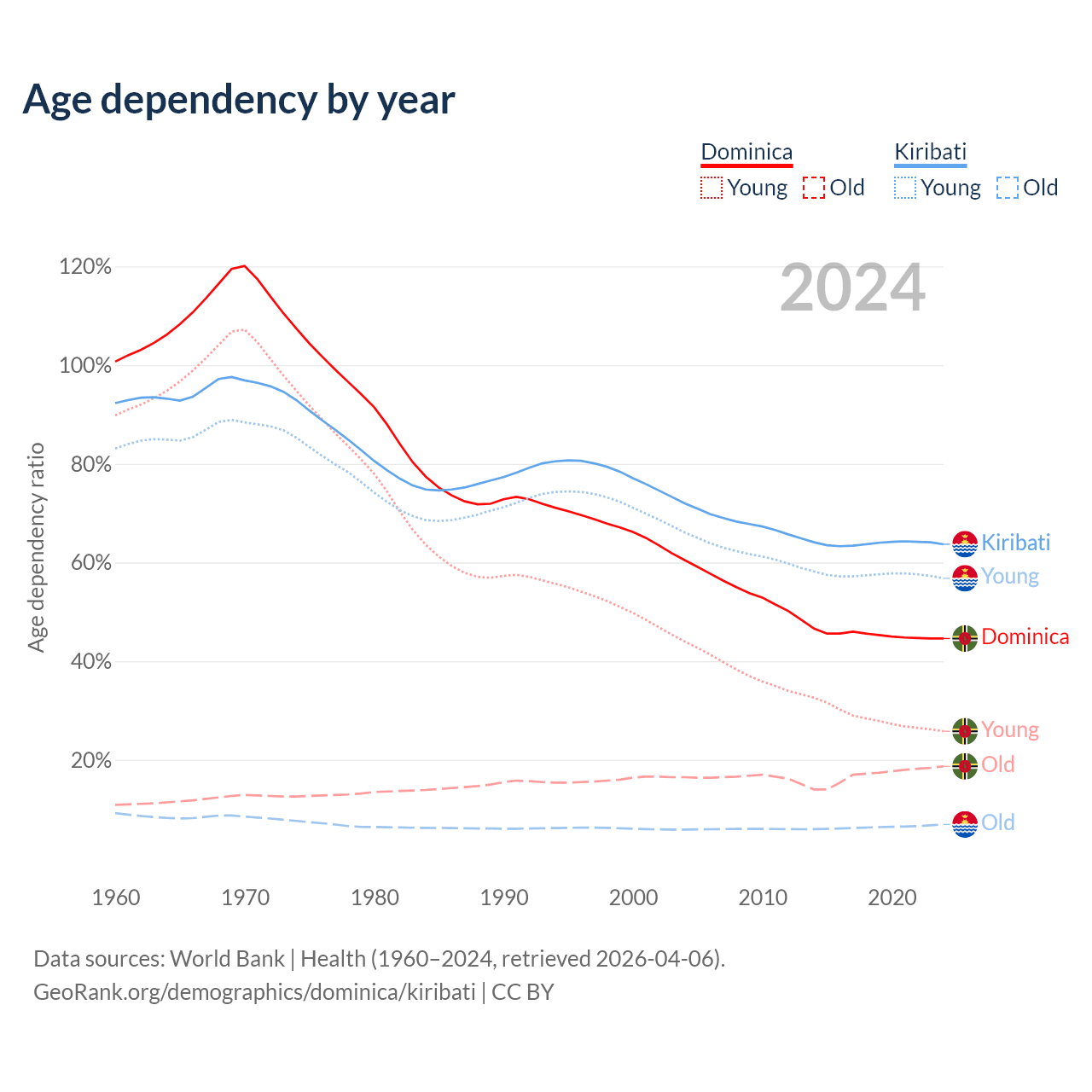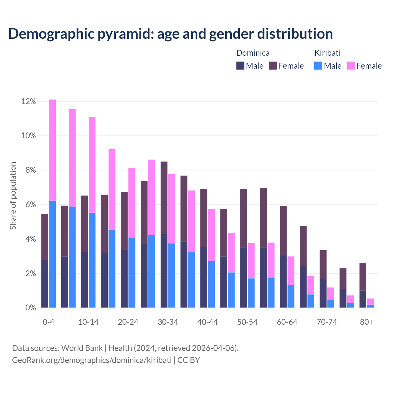 - Dominica is ranked 66/196 by median age (oldest to youngest) vs 139/196 for Kiribati.