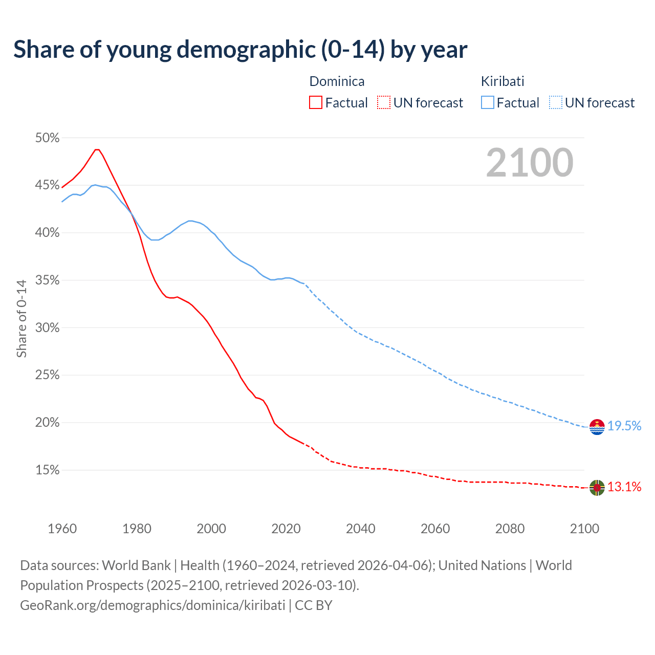 - The share of young demographic (0-15 years old) in Dominica is 17.9% vs 34.7% in Kiribati.