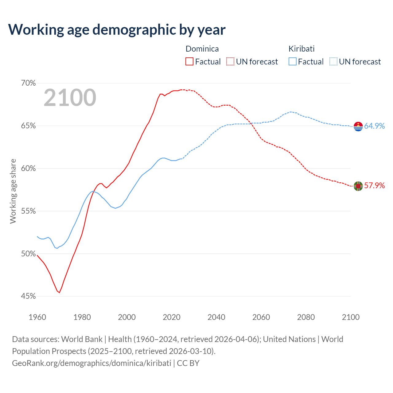 - Dominica has 45.3K working age adults (aged 15-64) vs 84.9K in Kiribati.