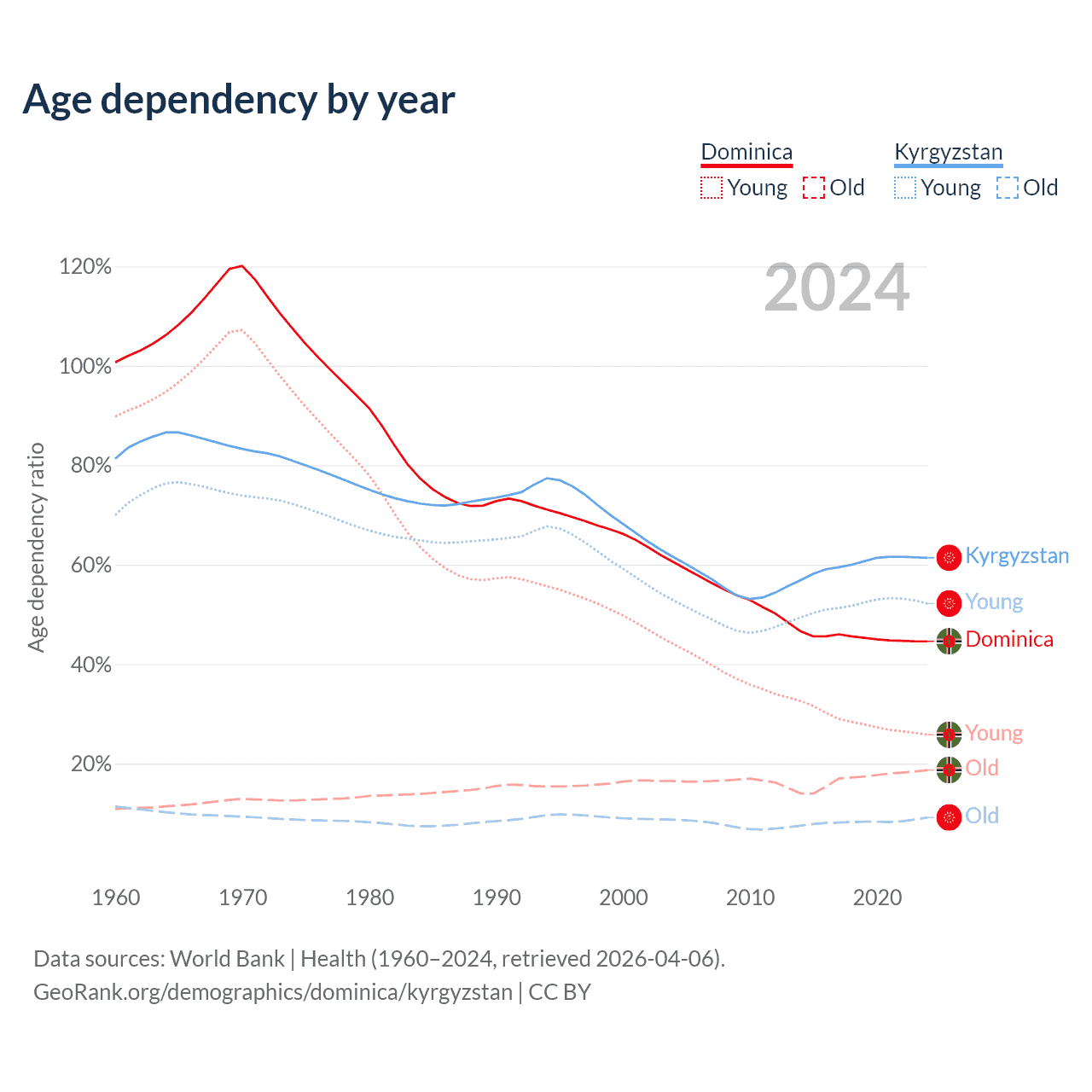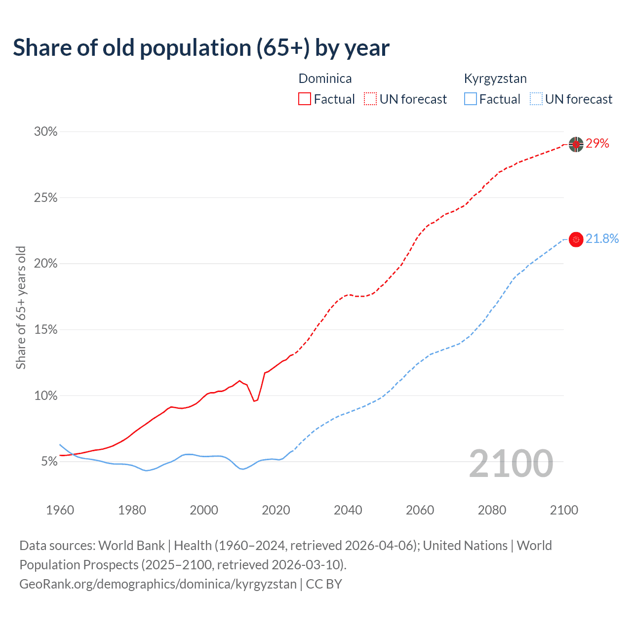 - The share of old-age demographic (65+) in Dominica is 13% vs 5.68% in Kyrgyzstan.