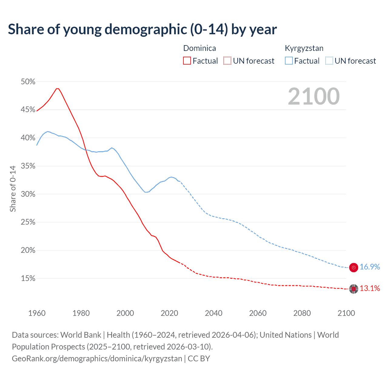- The share of young demographic (0-15 years old) in Dominica is 17.9% vs 32.3% in Kyrgyzstan.