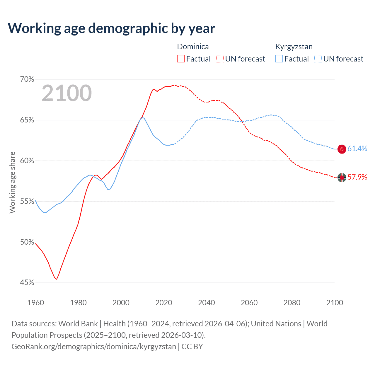 - Dominica has 45.3K working age adults (aged 15-64) vs 4.63M in Kyrgyzstan.