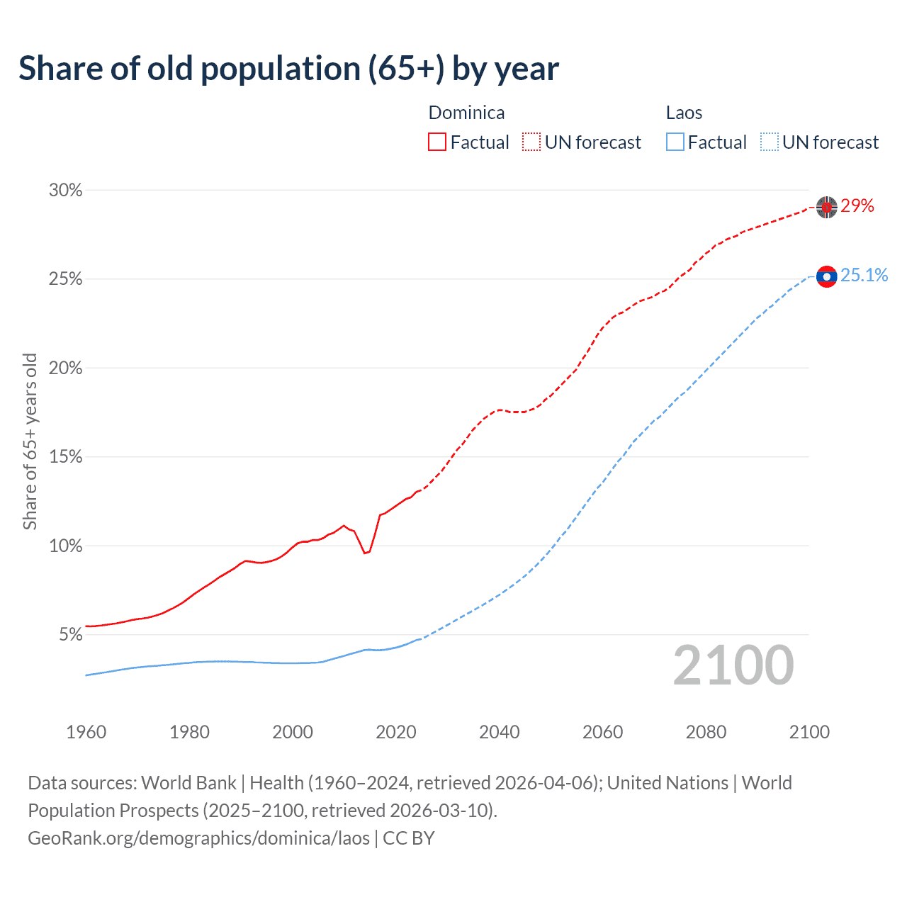 - The share of old-age demographic (65+) in Dominica is 13% vs 4.67% in Laos.