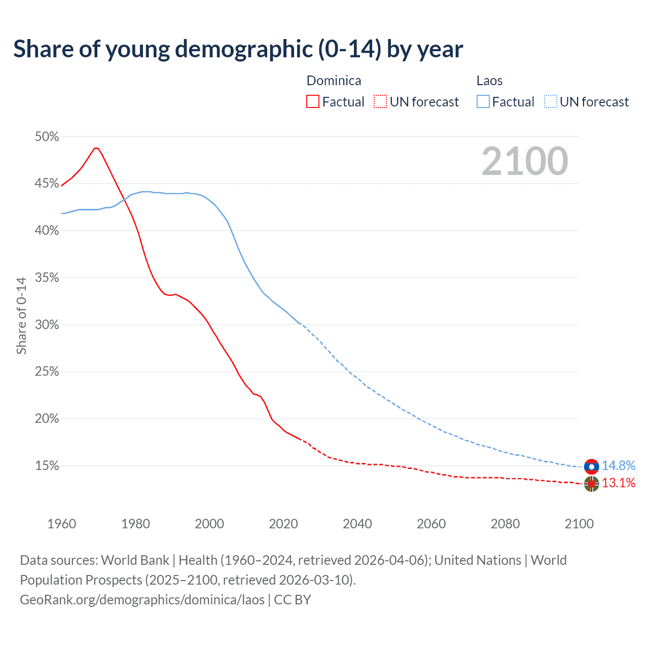 - The share of young demographic (0-15 years old) in Dominica is 17.9% vs 30.2% in Laos.