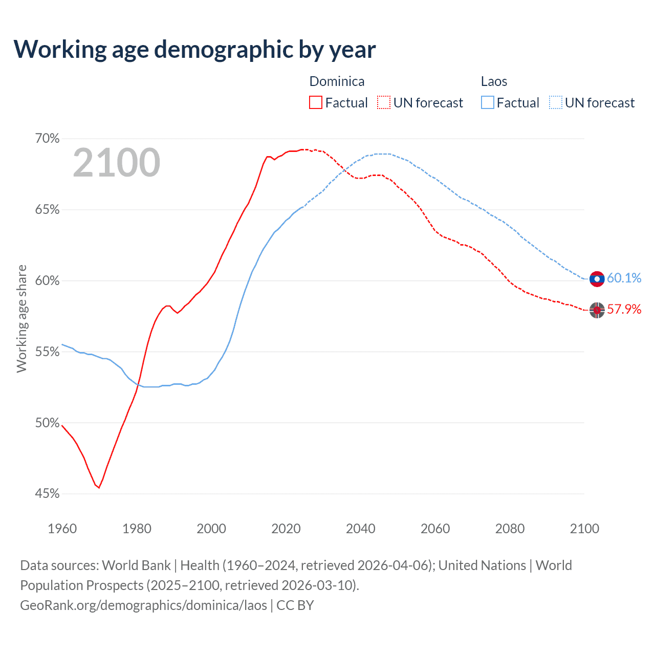 - Dominica has 45.3K working age adults (aged 15-64) vs 5.21M in Laos.