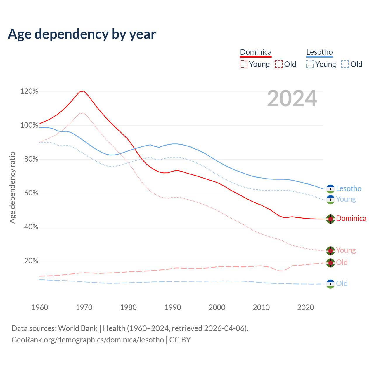 - Dominica is ranked 66/196 by median age (oldest to youngest) vs 143/196 for Lesotho.
