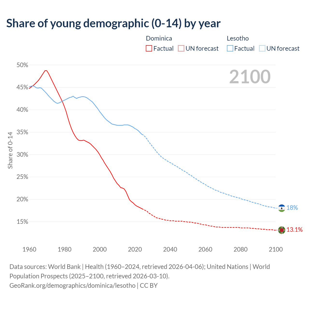 - The share of young demographic (0-15 years old) in Dominica is 17.9% vs 34.5% in Lesotho.