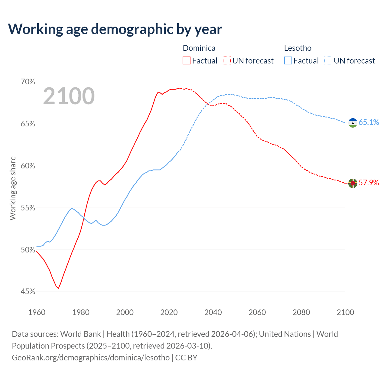 - Dominica has 45.3K working age adults (aged 15-64) vs 1.48M in Lesotho.