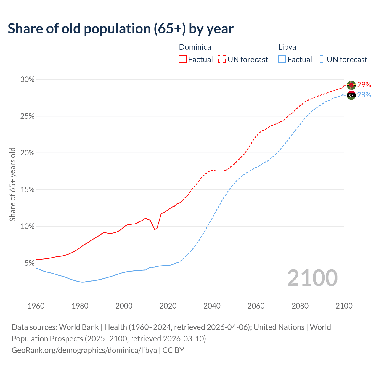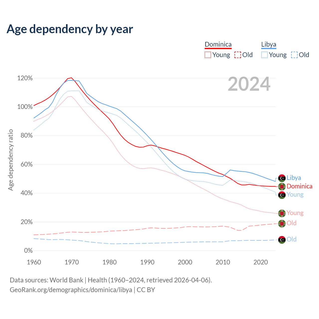 - Dominica is ranked 66/196 by median age (oldest to youngest) vs 114/196 for Libya.