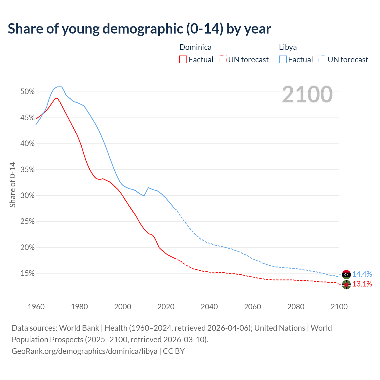 - The share of young demographic (0-15 years old) in Dominica is 17.9% vs 27.4% in Libya.