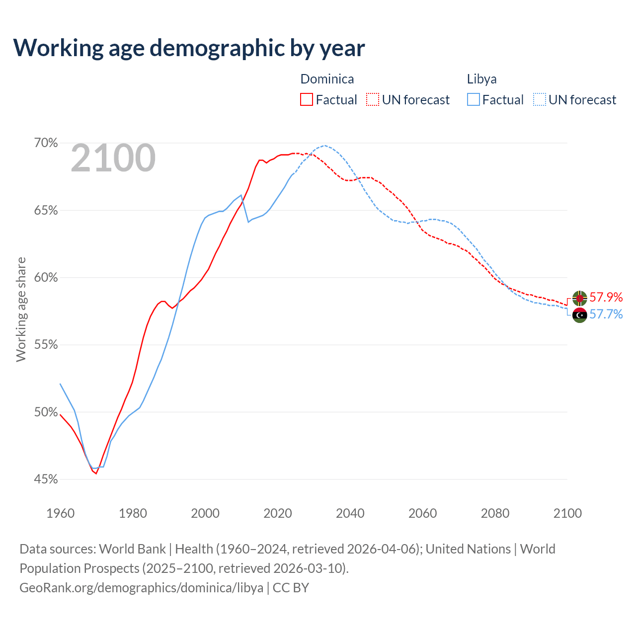 - Dominica has 45.3K working age adults (aged 15-64) vs 5.11M in Libya.
