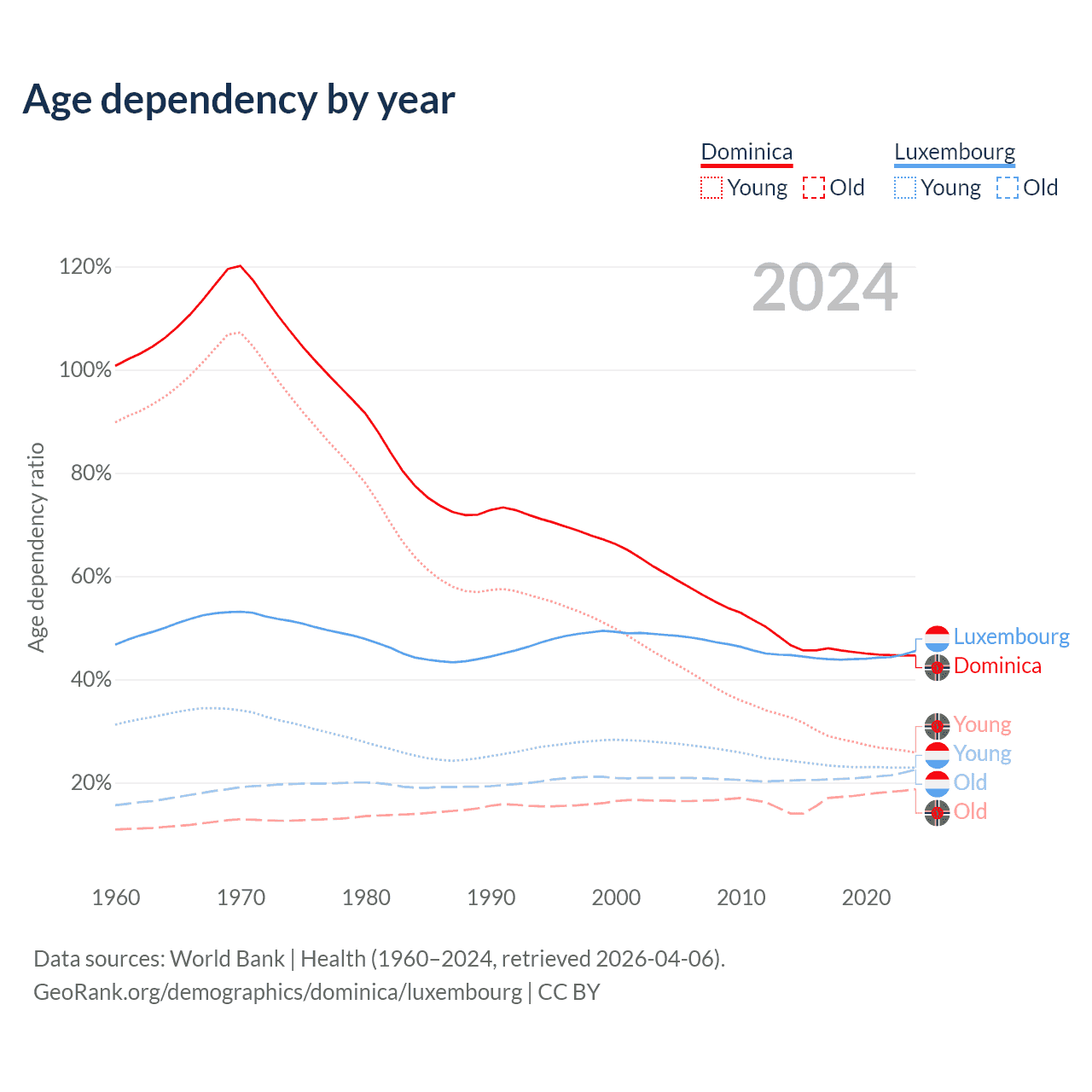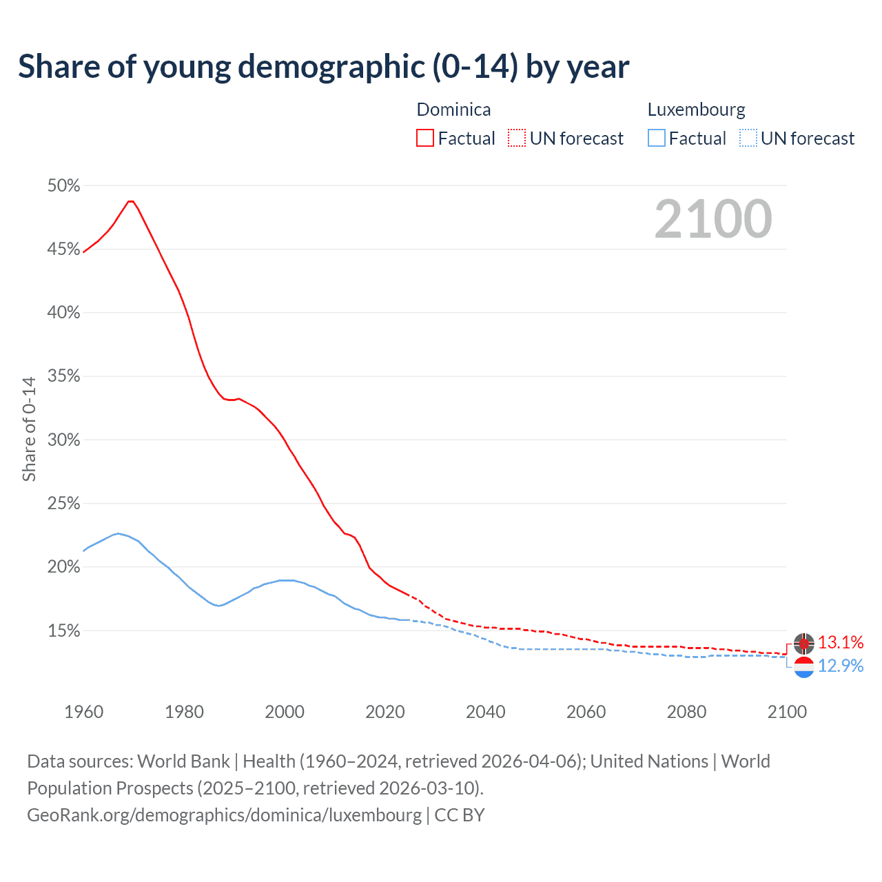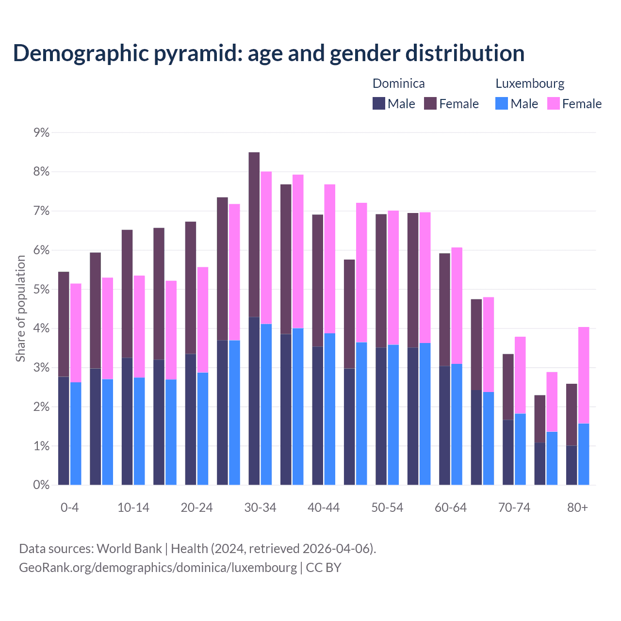- The share of young demographic (0-15 years old) in Dominica is 17.9% vs 15.8% in Luxembourg.
