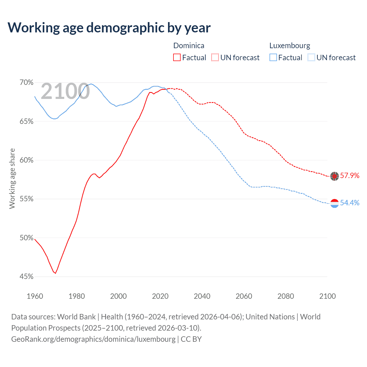 - Dominica has 45.3K working age adults (aged 15-64) vs 477K in Luxembourg.
