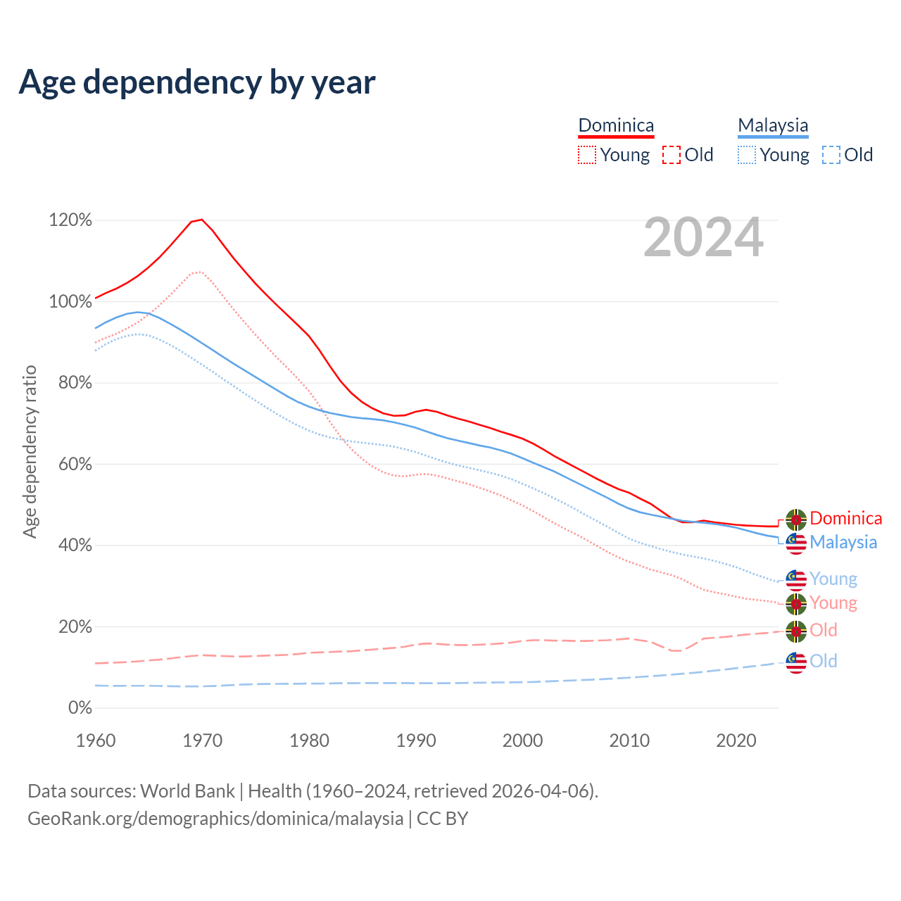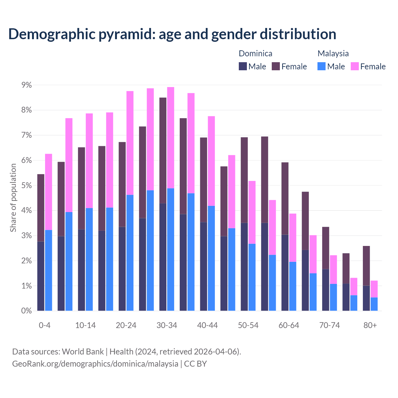 - Dominica is ranked 66/196 by median age (oldest to youngest) vs 92/196 for Malaysia.