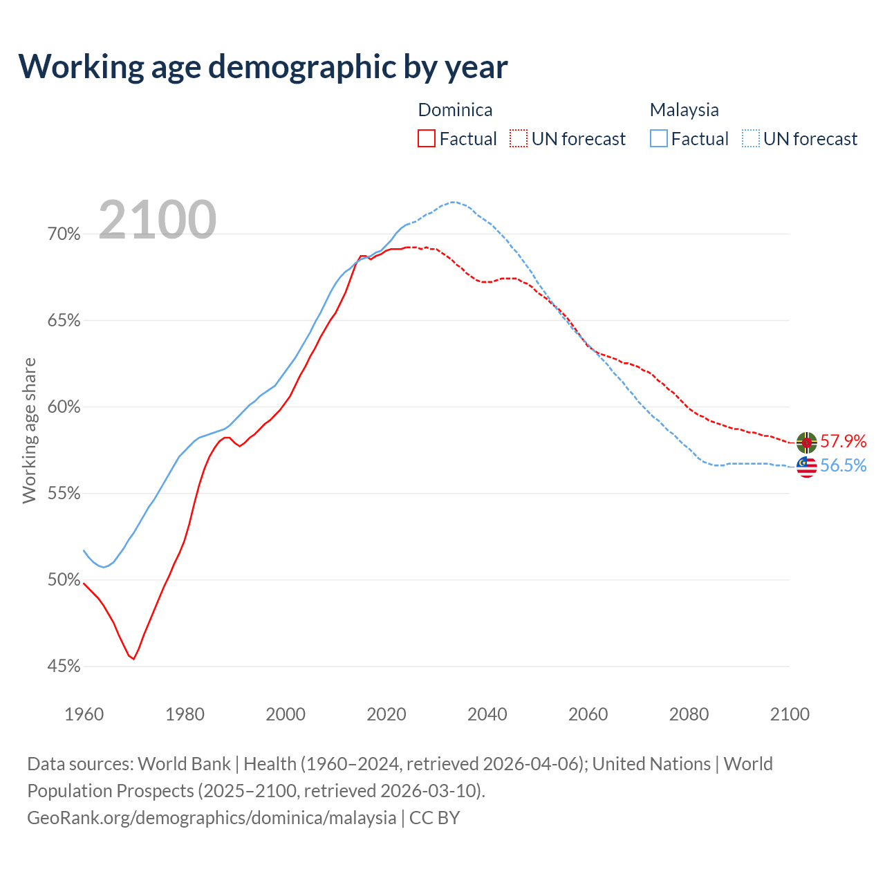 - Dominica has 45.3K working age adults (aged 15-64) vs 25.7M in Malaysia.