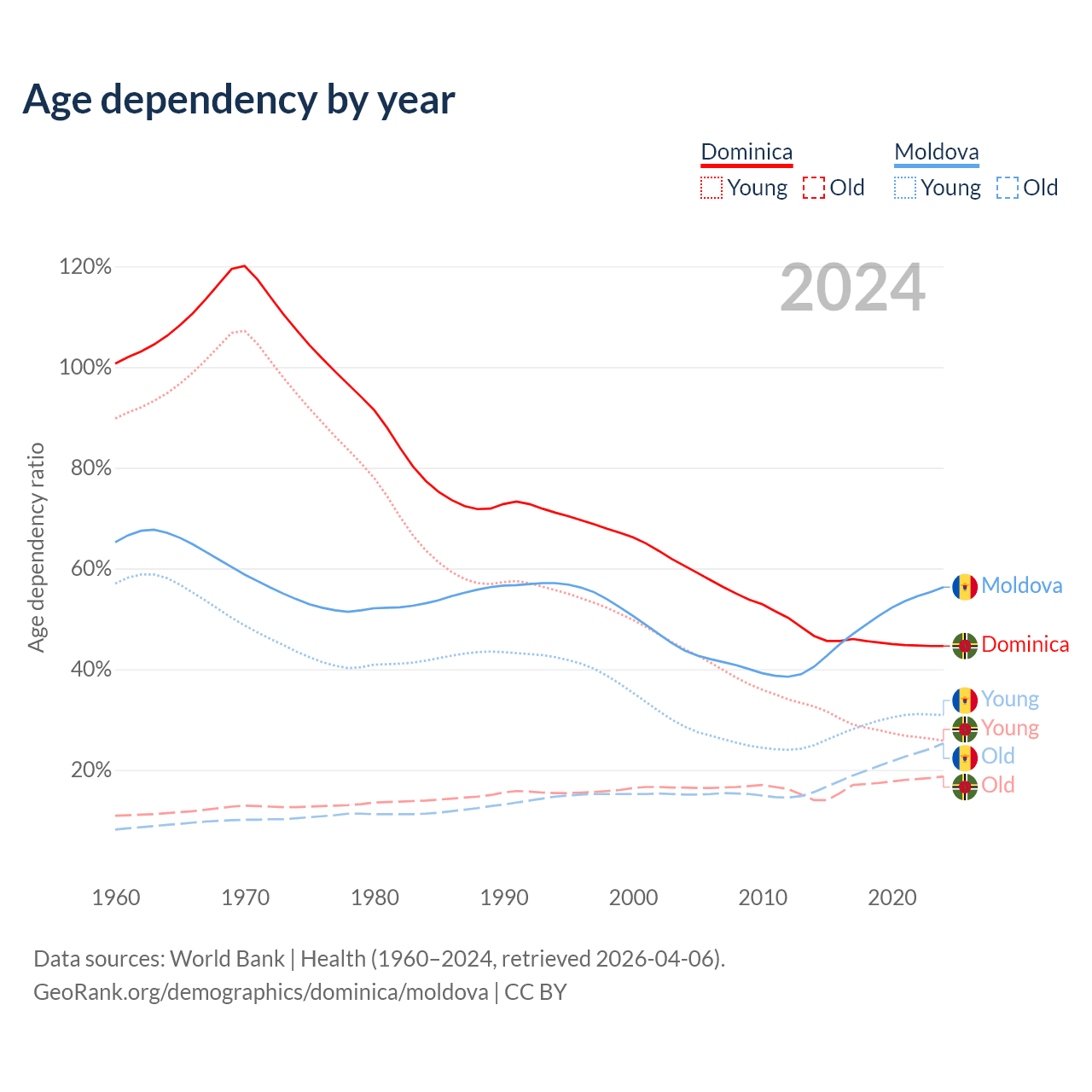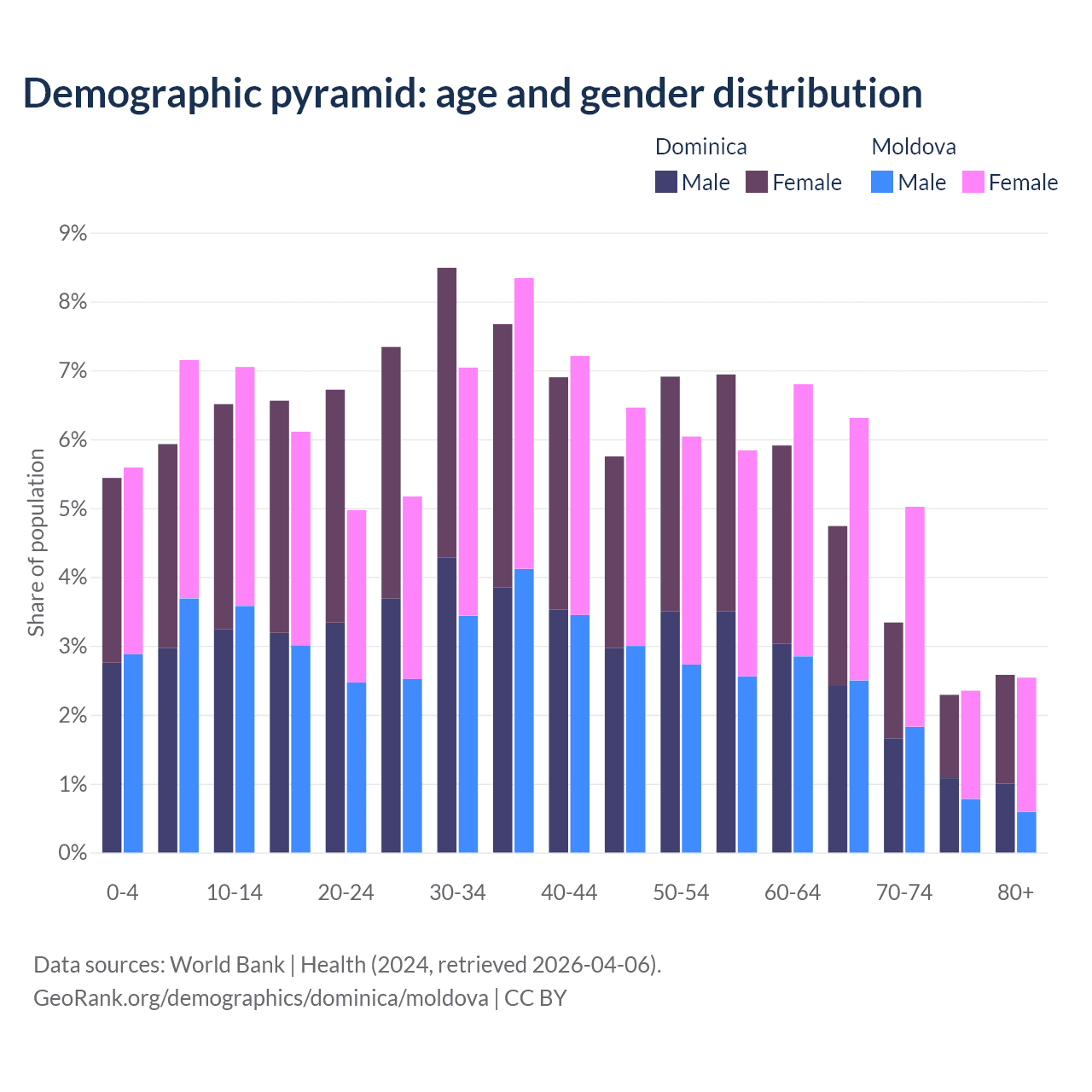 - Dominica is ranked 66/196 by median age (oldest to youngest) vs 54/196 for Moldova.