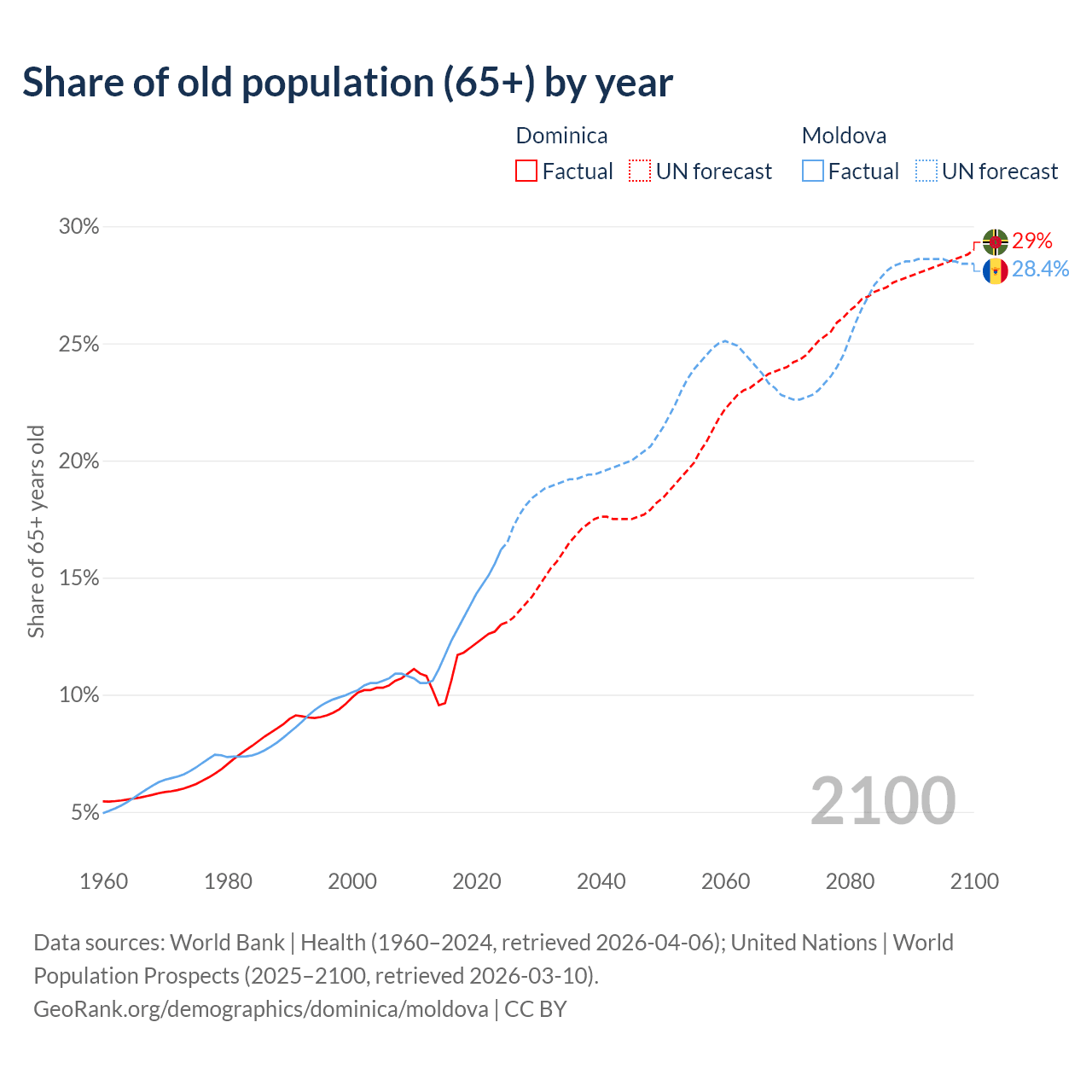 The share of older people aged 65 and over is 13% in Dominica and 16.2% in Moldova. Life expectancy in Dominica compared to Moldova .