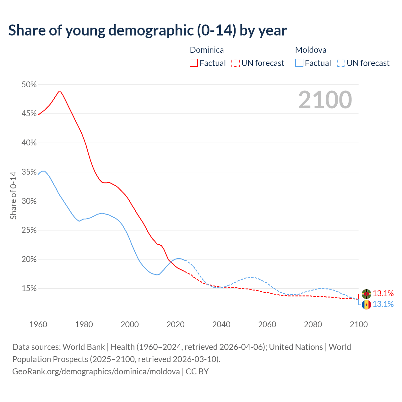 - The share of young demographic (0-15 years old) in Dominica is 17.9% vs 19.8% in Moldova.