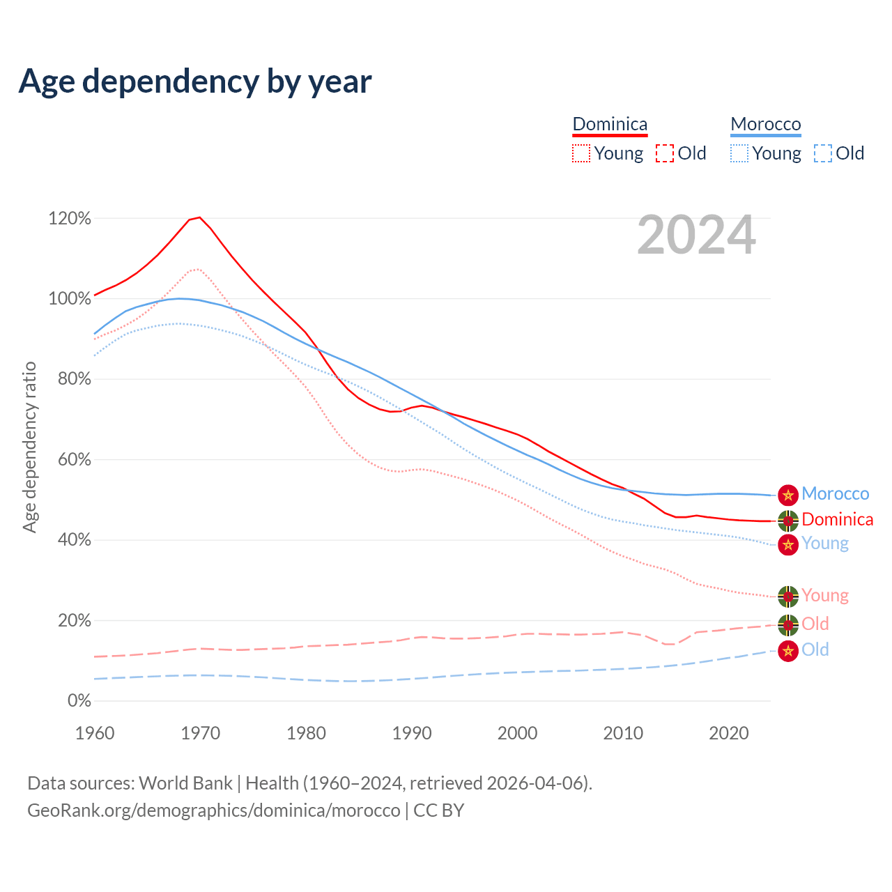 - Dominica is ranked 66/196 by median age (oldest to youngest) vs 100/196 for Morocco.